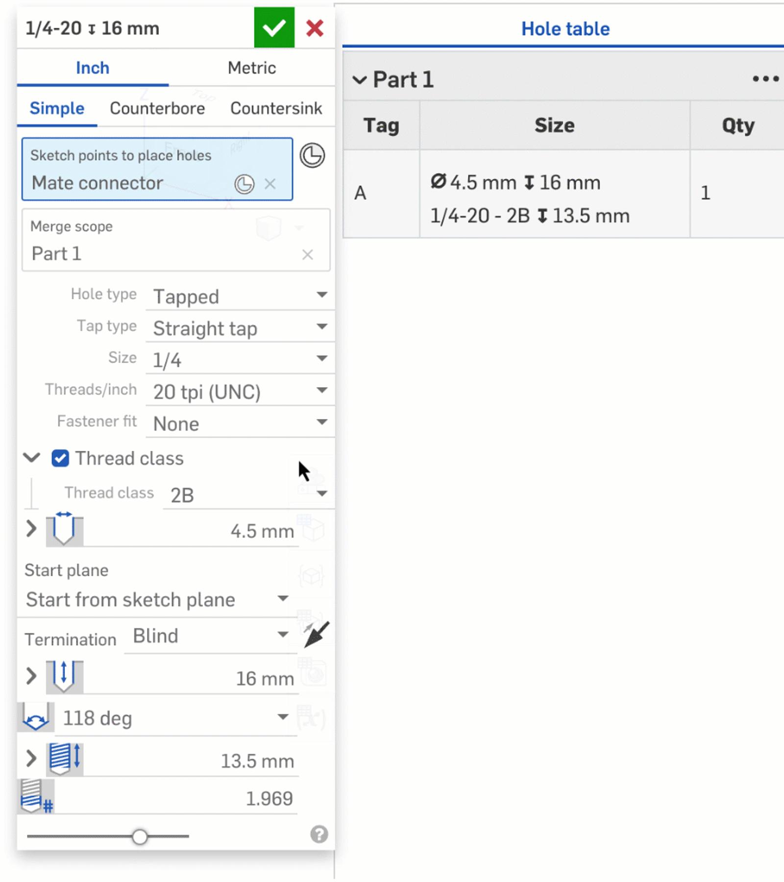 Tapped holes now include their pitch classification (UNC, UNF, UNEF, or UNEEF for Inch threads, Fine or Coarse for Metric threads) to make it easier to distinguish which type of fastener will be used. Also, Thread class is now optional for applications where this level of detail is not required.