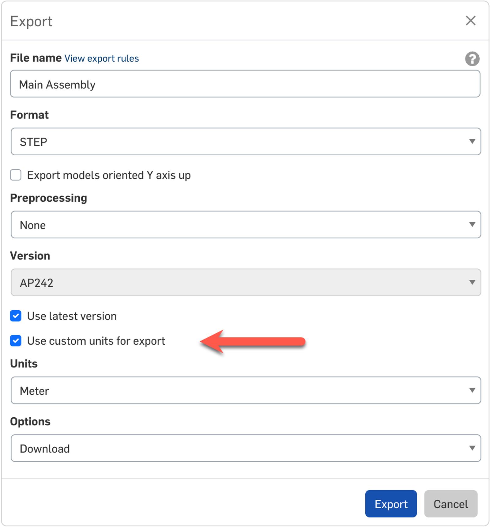 Multiple selected Parts can now be exported from an Assembly as a single file (so the part positions stay relative to the Assembly origin). The units of a STEP file can also be modified before export.