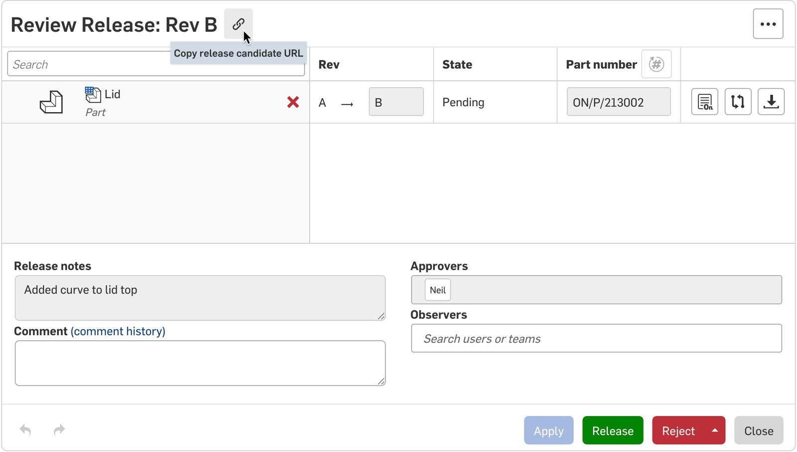 The URL to a Release candidate can now be easily shared with others using the Copy link icon in the Release candidate dialog.