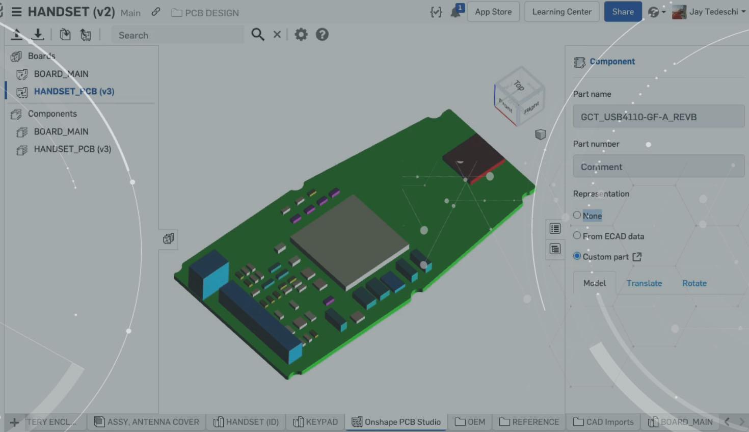 We are excited to announce the beta launch of our new PCB Studio, now available to all Onshape Professional and Enterprise users. With support for industry-standard PCB file formats and dedicated circuit board component libraries, this new functionality makes it easier than ever to collaborate with engineers designing printed circuit boards.