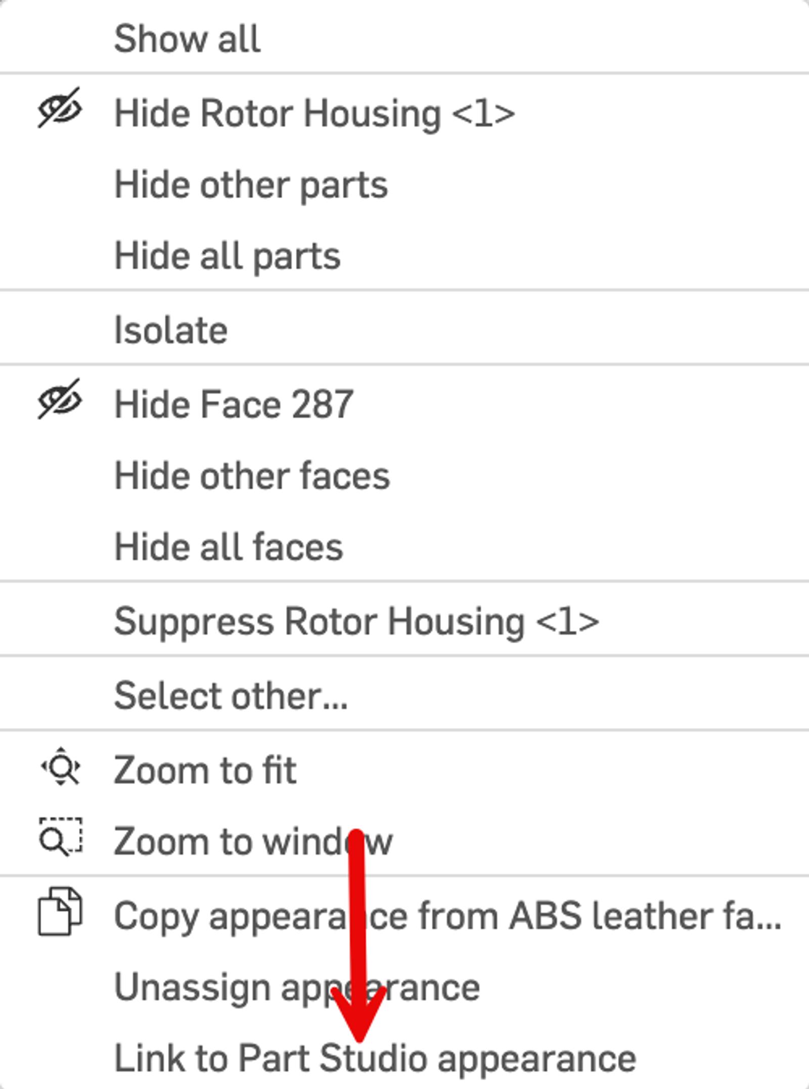 If faces have an appearance set in the Part Studio, and their appearance is changed in Render Studio, they can now be reset to the original Part Studio appearance via the Scene list or graphics area context menu.
