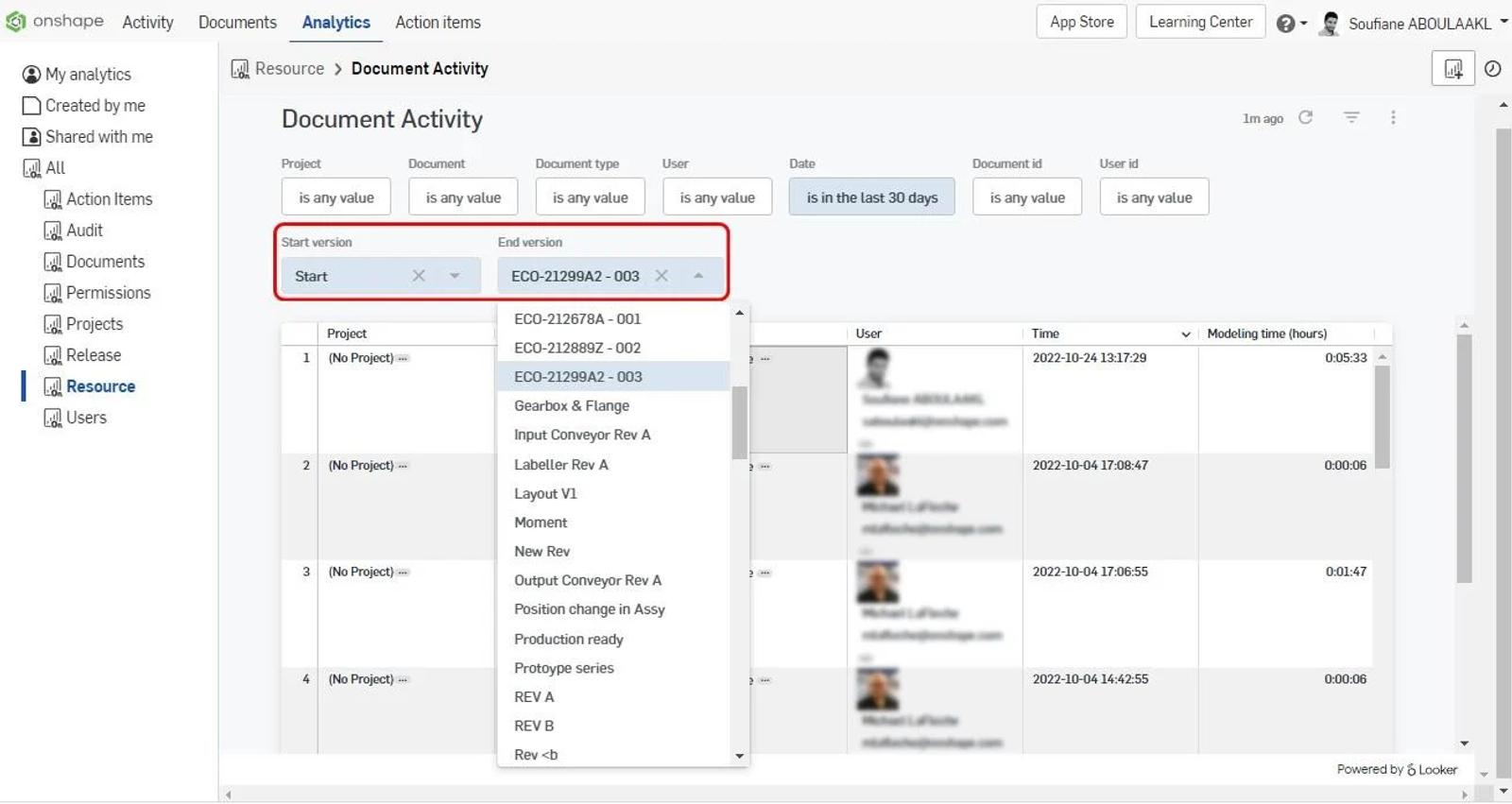 In Analytics of Onshape Enterprise, Start Version and End Version Filters have been added to the Document Activity Dashboard. The dashboard now shows the Document Activity including the modeling time between specific versions of the same document.
