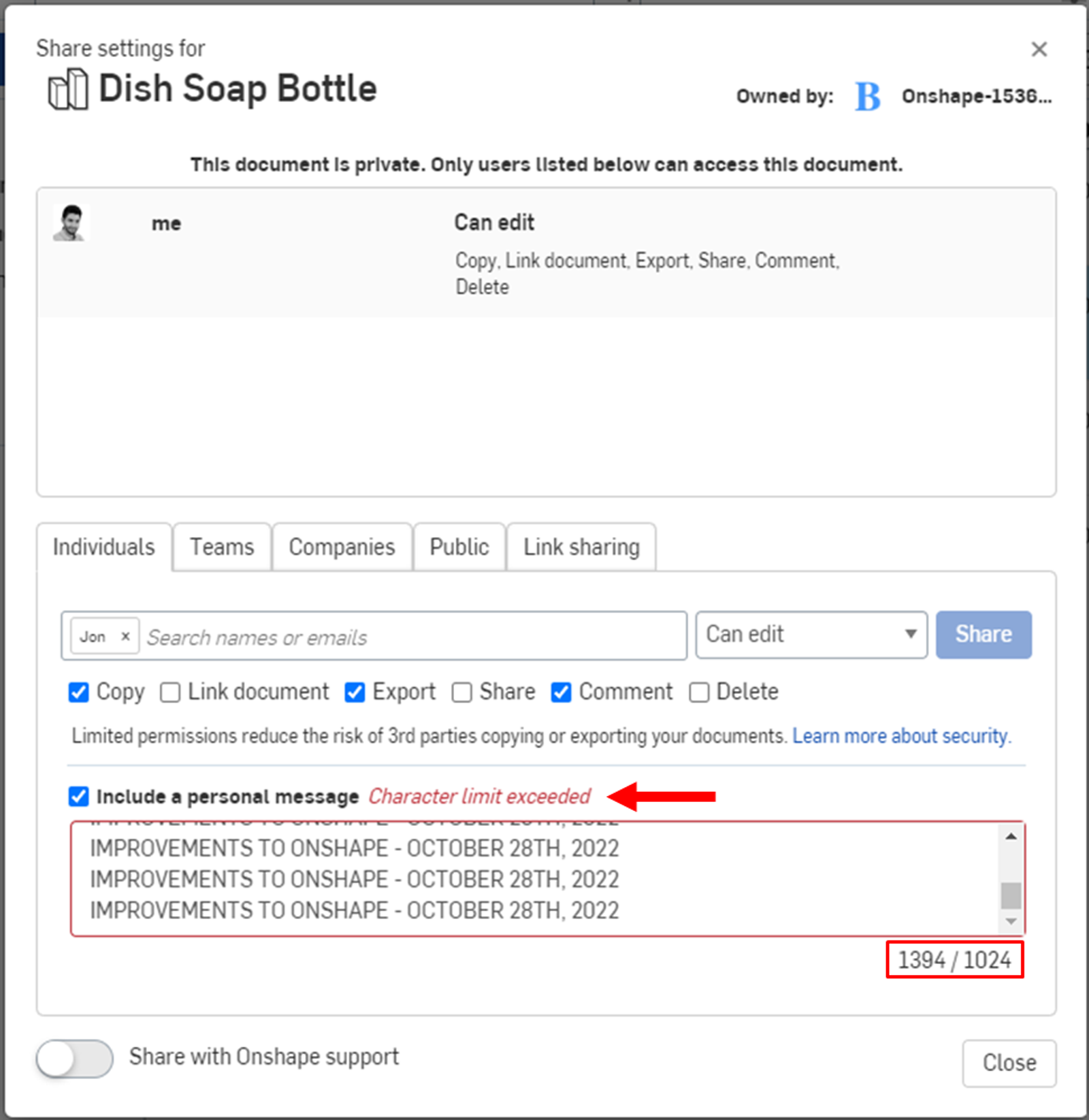 When you start composing your personal message in the Share Setting dialog, Onshape now lets you know when you’ve gone over 1,024 characters. This gives you tangible feedback as you type.