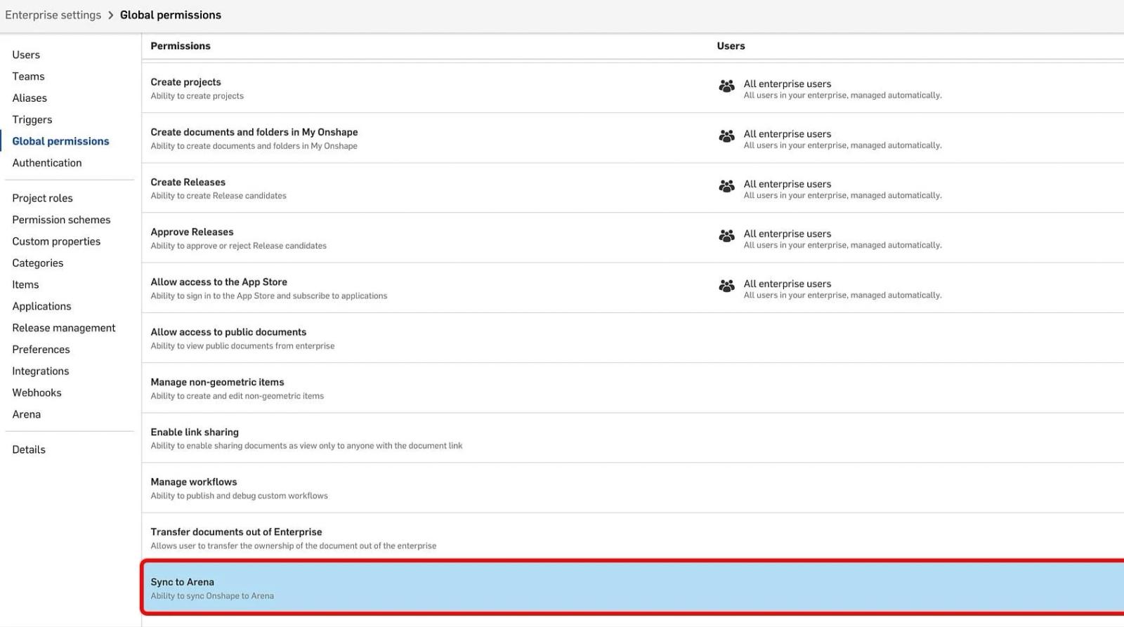 This new global permission allows an Onshape administrator to control which users in the enterprise have the ability to sync Onshape objects to Arena PLM.