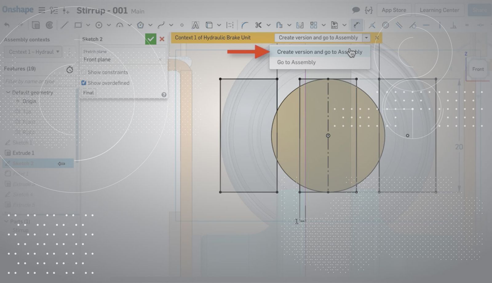 Onshape Assemblies now support the ability to edit and create in-context geometry across Linked Documents. When returning to your top-level assembly from another Document, Onshape gives you the option to automatically version the Linked Document and update the parent Document to reflect those changes.