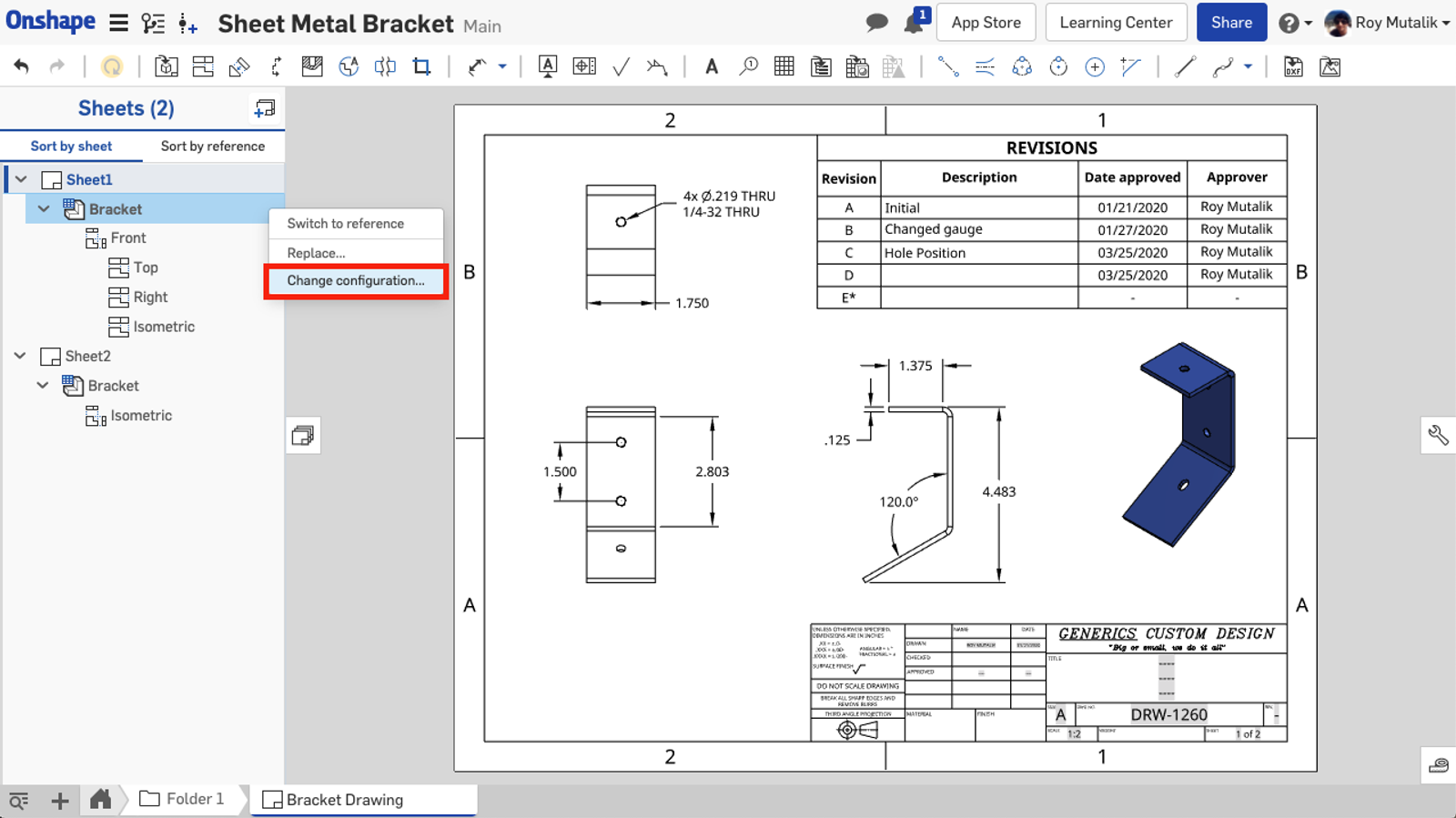 You'll now find a right-click option to change the configuration of a part or assembly from the sheets panel in an Onshape Drawing.