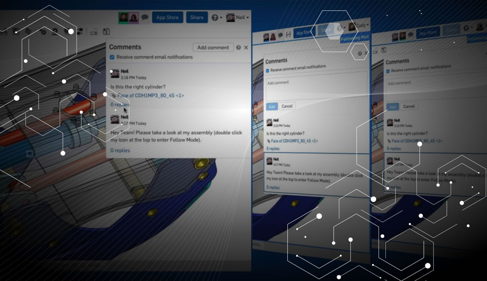 The Comments system now supports real-time text chat between multiple users working in the same Onshape Document.