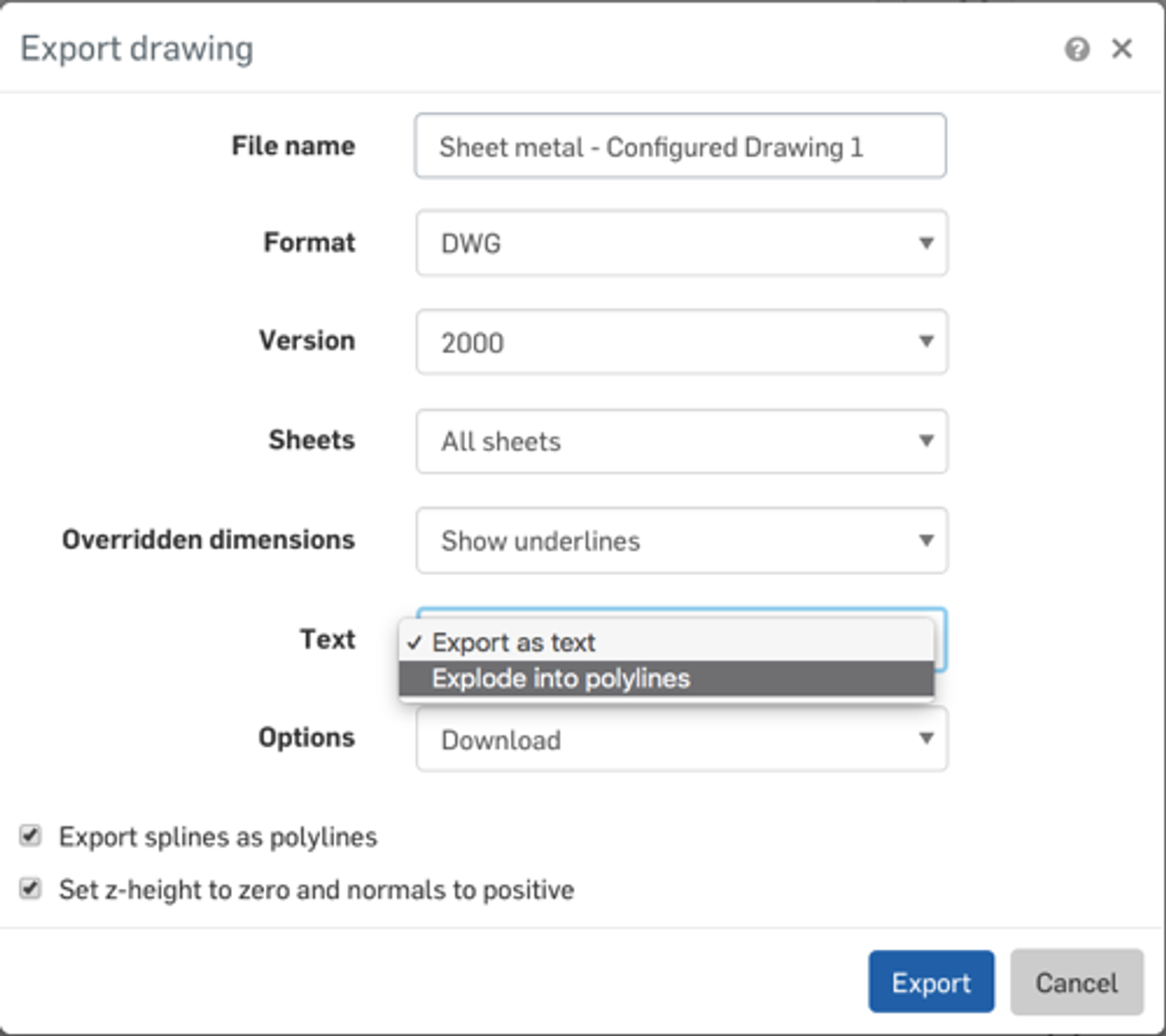 When exporting a drawing, you now have the options to remove bends and tangent lines, and choose to export spline data as splines instead of polylines. These options are available at the bottom of the drawing export dialog.