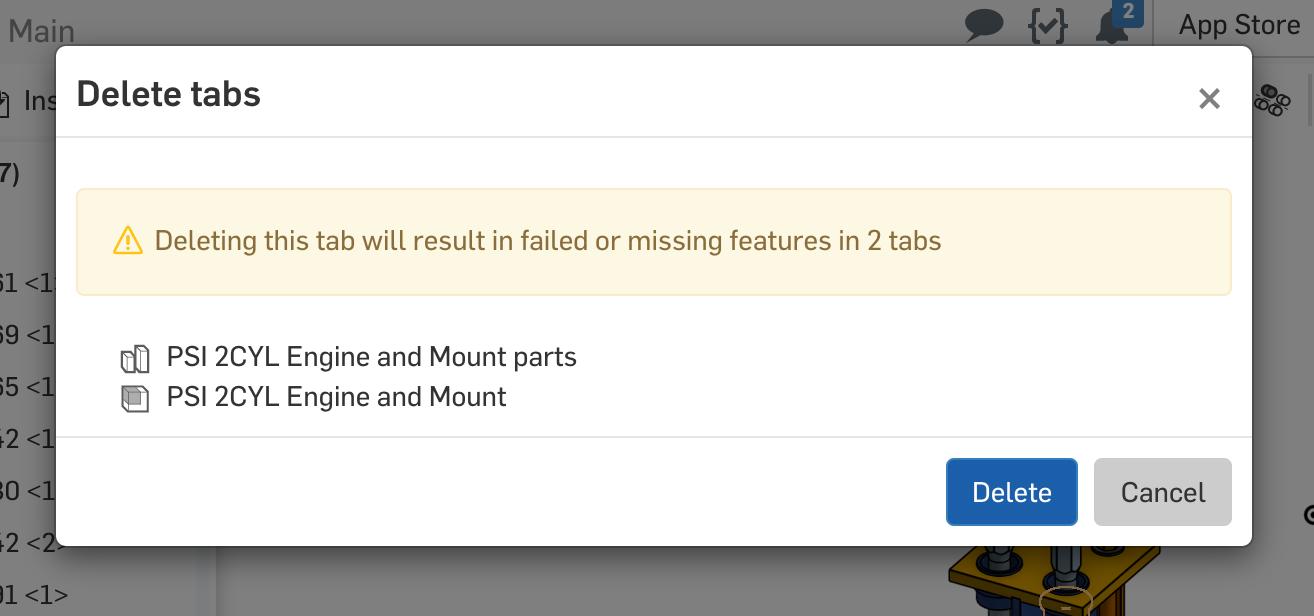 When you delete a tab in Onshape, you will now be warned if this will cause conflicts elsewhere. This will help you understand the implications of that action before making a decision. Clicking "Delete" finalizes the deletion, while selecting "Cancel" closes the dialog without deleting any tabs. If the tab is able to be deleted without causing any conflicts, it will simply be deleted with no warning.