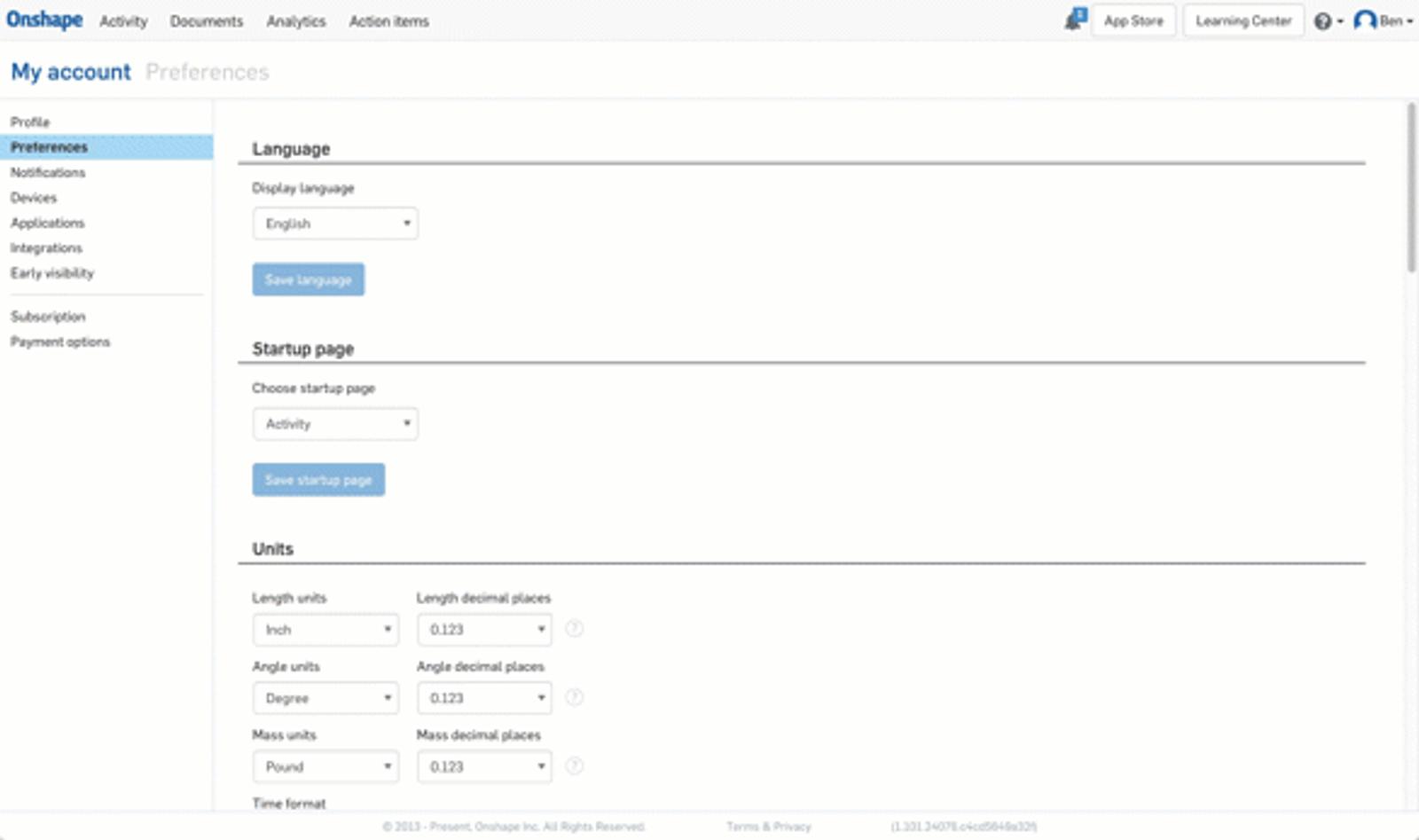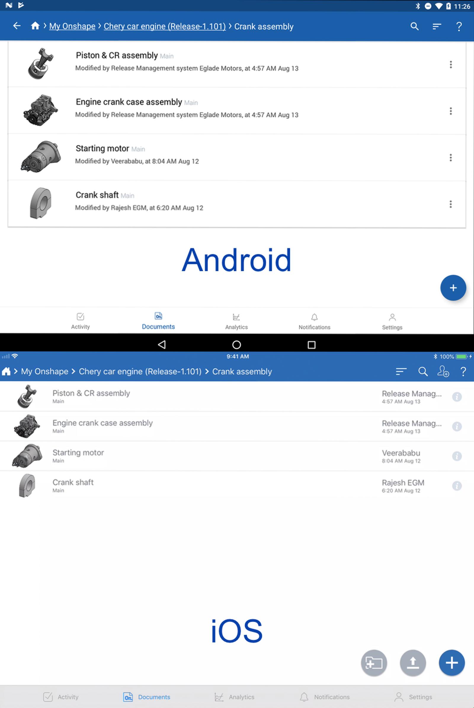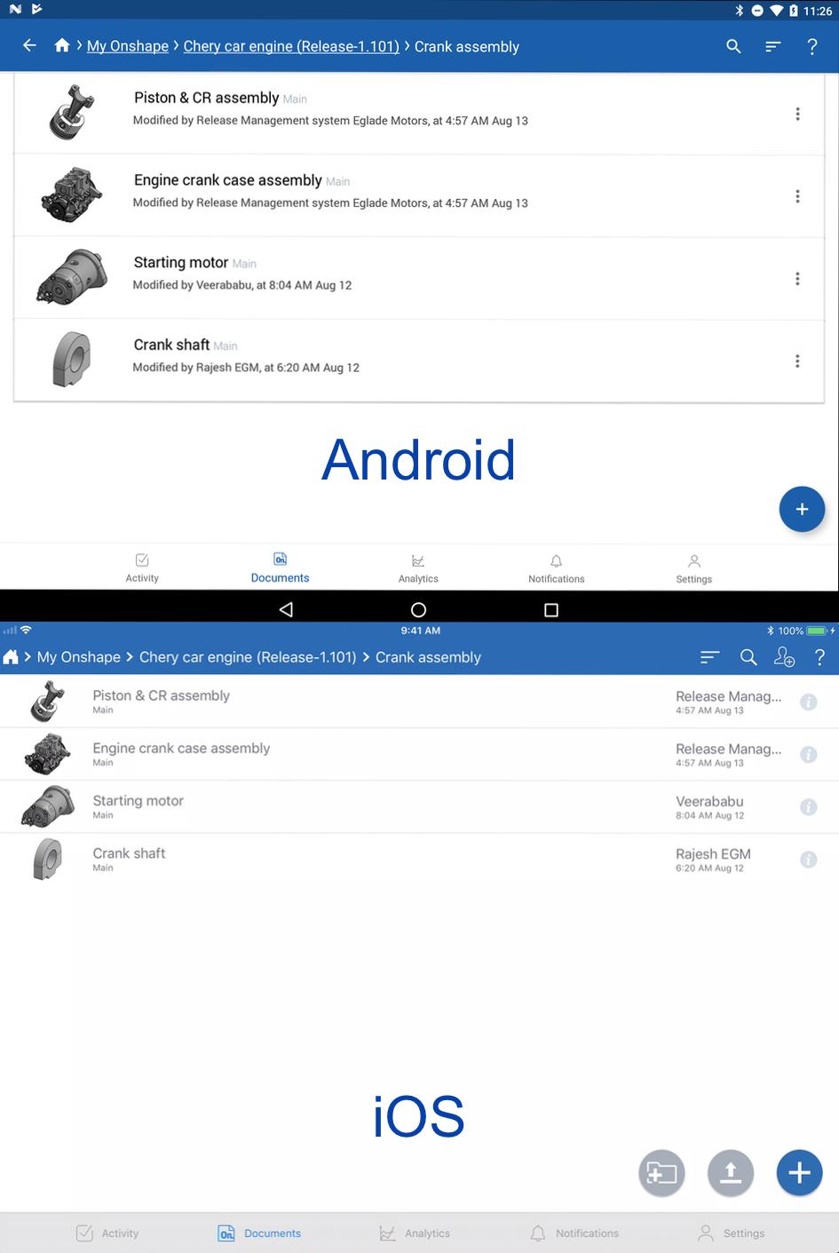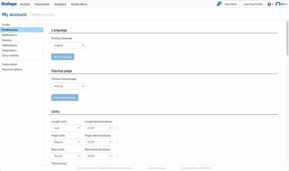 Onshape Enterprise users can now specify their start page (Analytics, Documents, Activity, or Action Items). Upon logging into Onshape, this will be the page they see. This is also available for the Android mobile app.