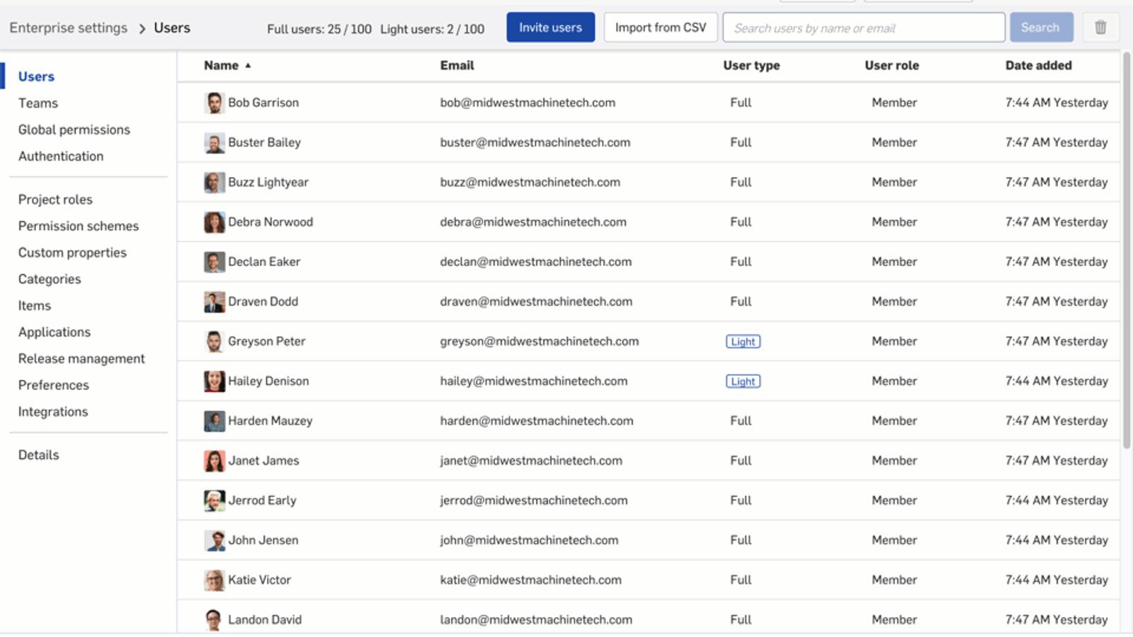 In Onshape’s Enterprise settings, you can sort the Users interface by Name, User Type, and Date added.