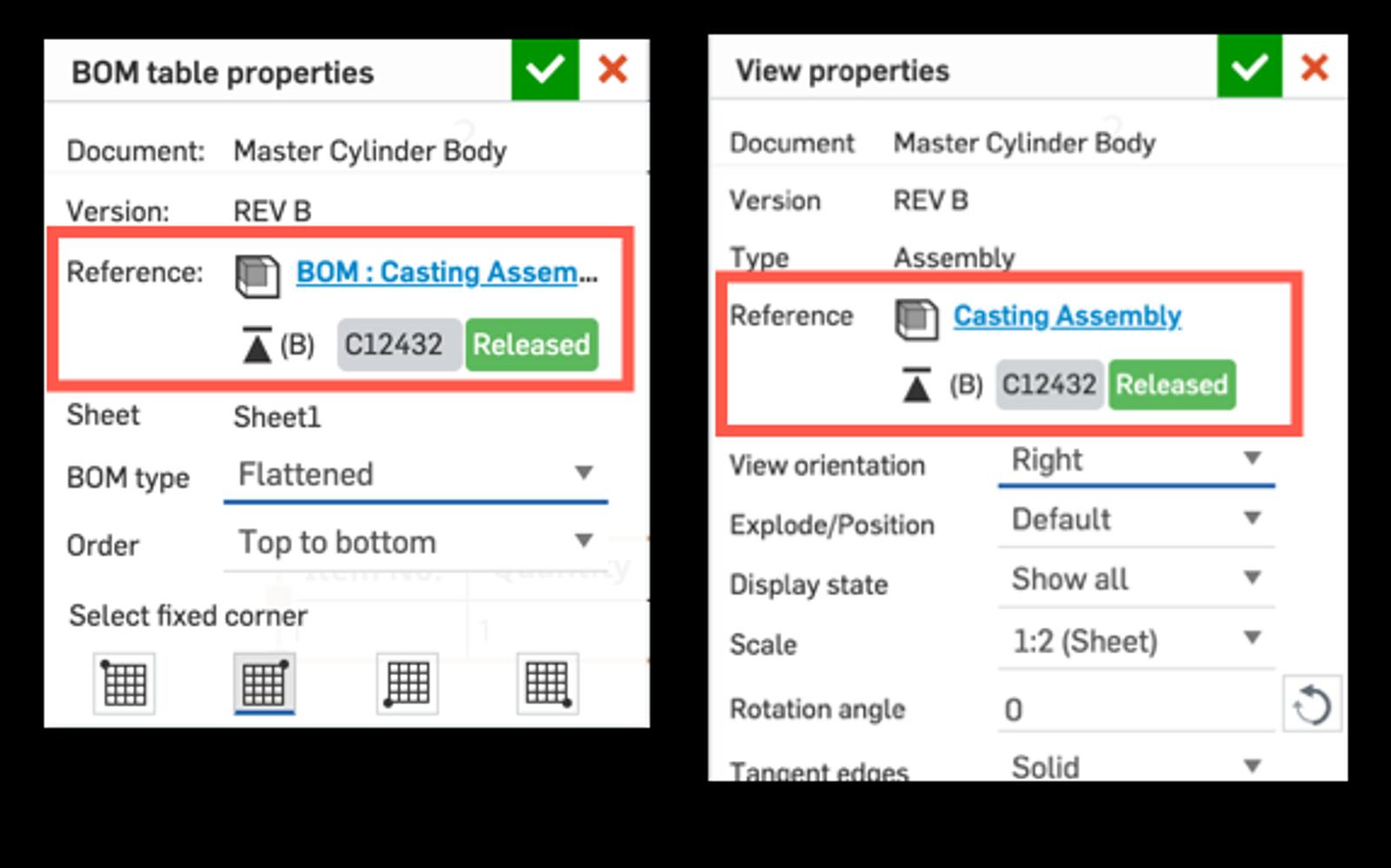 Drawing View properties and BOM Properties now show more detailed information about the referenced model including the workspace/revision/version Name, Part Number, Revision, and State.