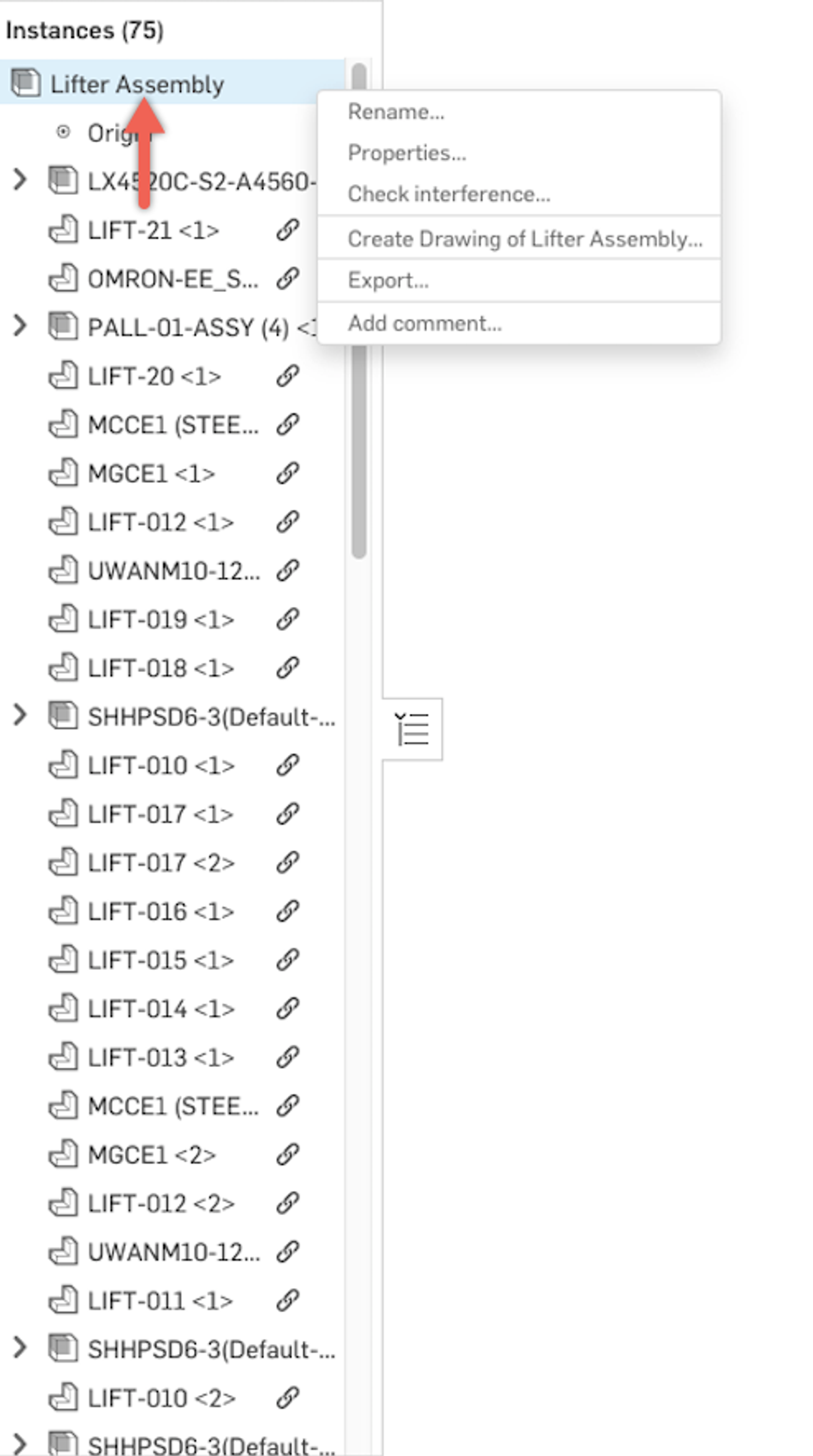 You will find a top-level assembly handle at the top of your instance list in Onshape Assemblies. This makes it easy to select everything in the assembly for things like interference detection, and calculating mass.