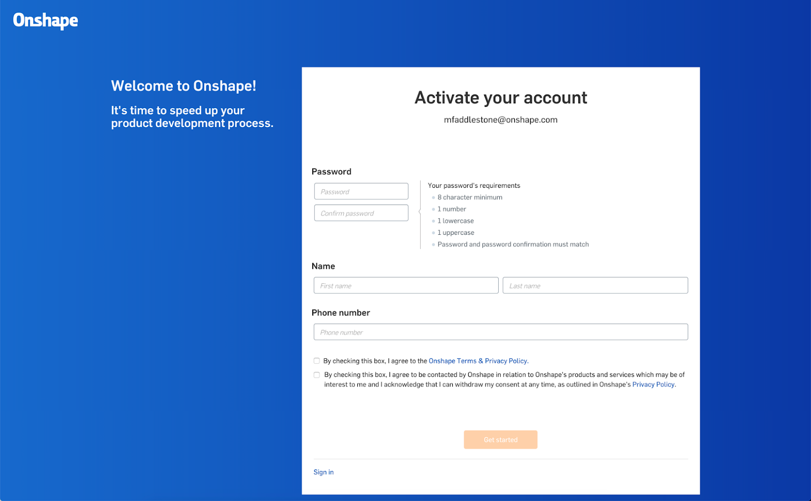 The password creation page has been redesigned for the account activation process for first-time users. New users, vendors, and suppliers you collaborate with in Onshape will now experience an easier account set-up process.