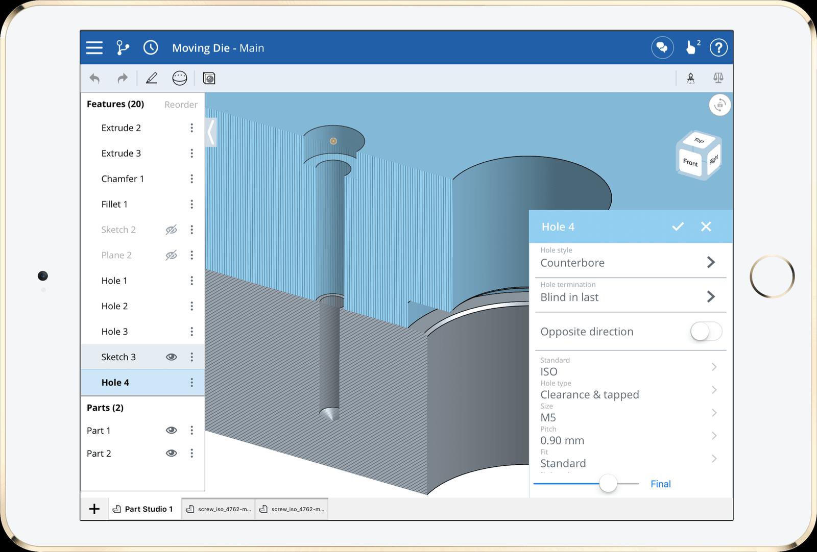 You can now create standard ANSI inch and ISO metric holes, using the Hole feature on iOS devices. To create a standard hole, specify the standard, size, depth, and if it’s a clearance, tapped or drilled hole. If it’s tapped, the correct drill size will be selected for you. When bolting two or more plates together, you can specify that the top plates have clearance holes and the bottom plate is tapped.