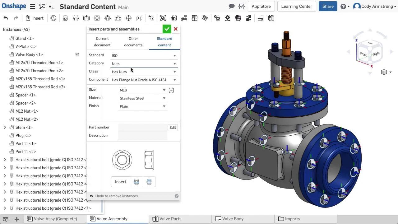 Onshape now provides a built-in library of standard fasteners for use in assemblies. Each fastener includes a mate connector to make them easy to assemble. Automated assembly tools make stacks of fasteners like “bolt-washer-washer-nut” combinations easy to build.