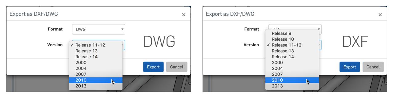 Sketches can now be exported to older versions of DWG and DXF to provide compatibility with older 2D CAD systems, nesting programs, and machine controls. Sketches can be exported to DXF Release 9 and 10, and to both DXF and DWG Release 11-12, 13, 14, 2000, 2004, 2007, 2010, and 2013. To access, right click a sketch in the Feature list and select Export as DXF/DWG.
