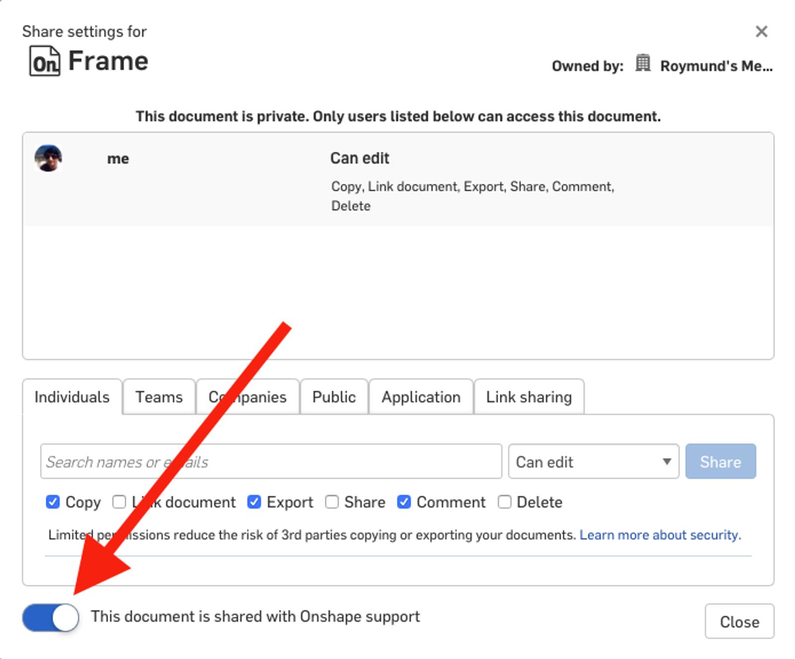 It’s worth repeating that Onshape Support only has permission to access your Documents (as shown above) if you explicitly give them permission. This is done via the "Share this Document with Onshape Support" checkbox while creating a support ticket. Remember, you can always revoke this access at any time by selecting the "Share" button within the Document and toggling the slider in the bottom left corner.