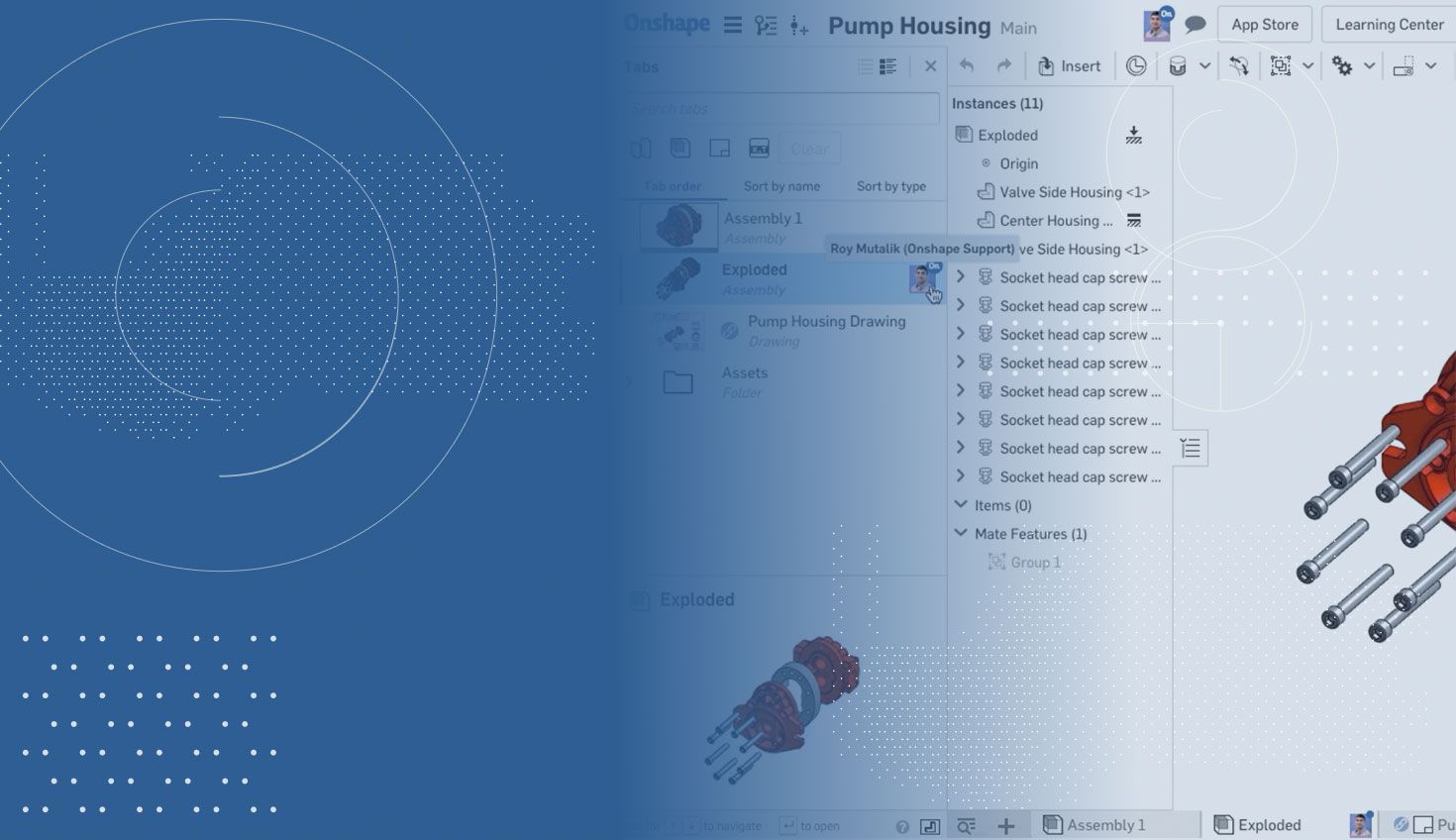 As always, you will see the "social cue" showing the avatar of any individual in your Document at the top of your screen, on the tab itself, and in the tab manager. Avatars for Onshape employees now include the Onshape logo – and hovering over the avatar will show the user’s full name and identify them as a member of Onshape Support.