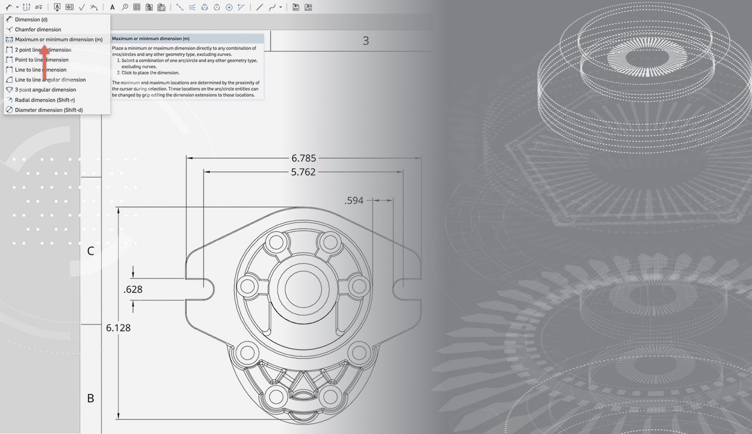 You will find a new Min/Max Dimension type in Onshape Drawings. This new dimension makes it easier to dimension to the inside or outside of arcs or circles.