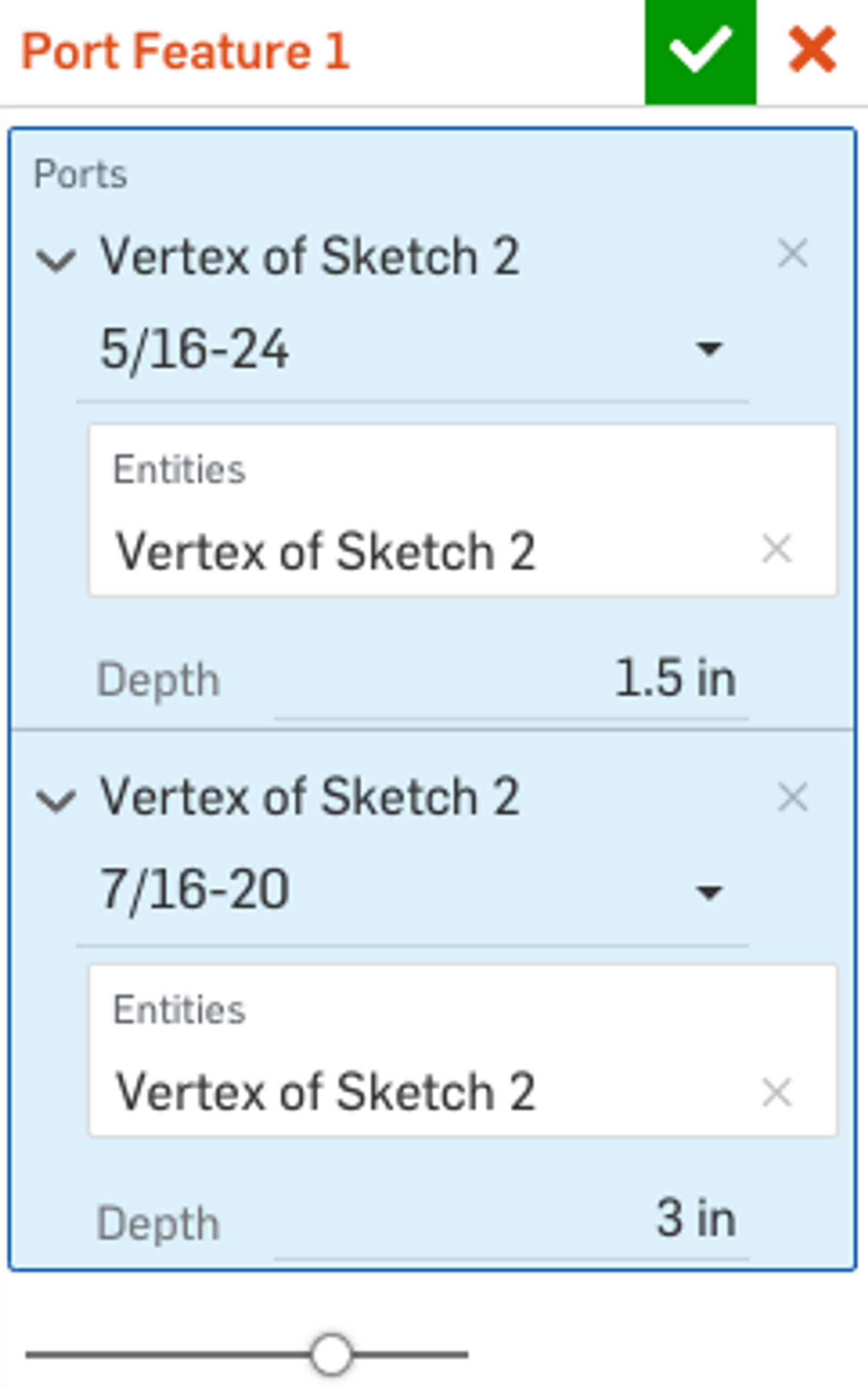 The foundation has been laid to allow you to make per selection changes to parameters in Onshape while creating a feature. This means you can have different settings for each selection within a dialog. Currently, you can only see this in the Fill command (where you can make "per edge" continuity choices), but we are working on more features with this capability. Below is an example of the custom "Port Feature" that has been modified to allow the user to change port size for each selection.