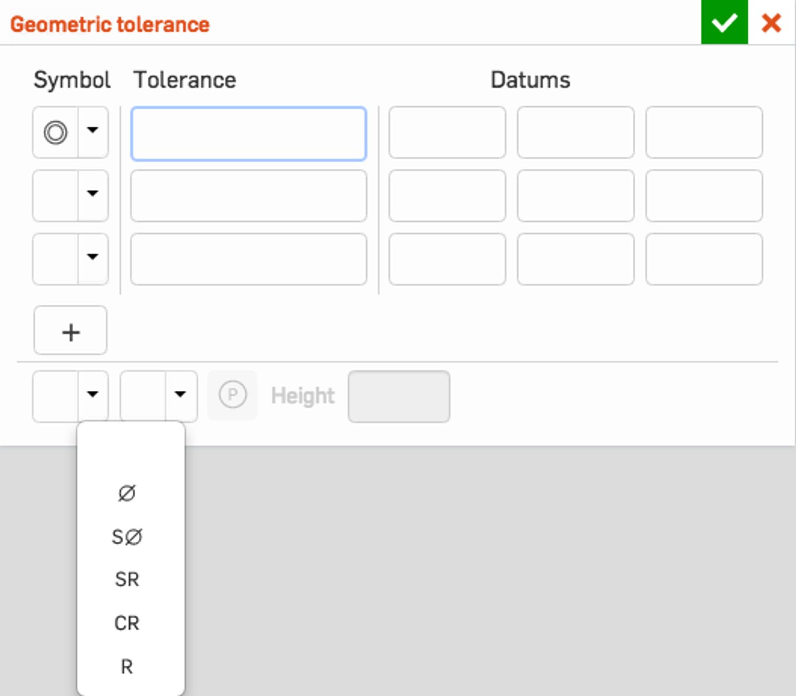 Geometric tolerance improvements include the ability to insert more than two control frames, and new tolerance icons for spherical diameter, radius, controlled radius, and spherical radius.