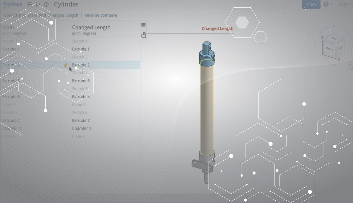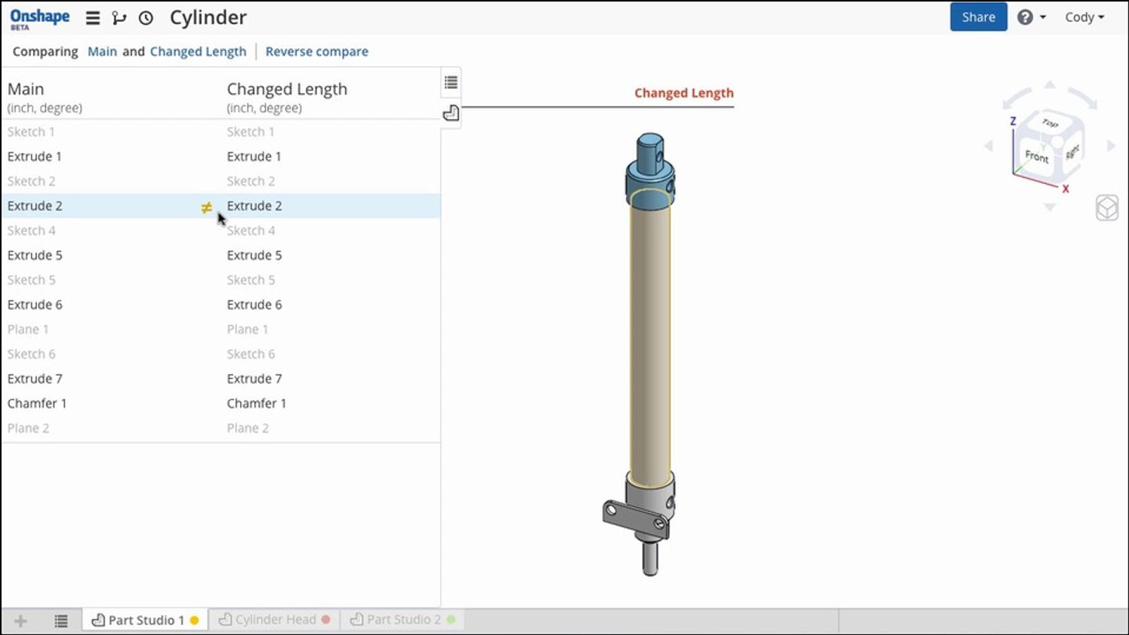 With this update we’ve added the ability to compare two versions, workspaces, or moments in history of a Part Studio. You will see the “Compare” command in the Actions menu. Onshape uses the currently active version or workspace as the basis for the comparison.