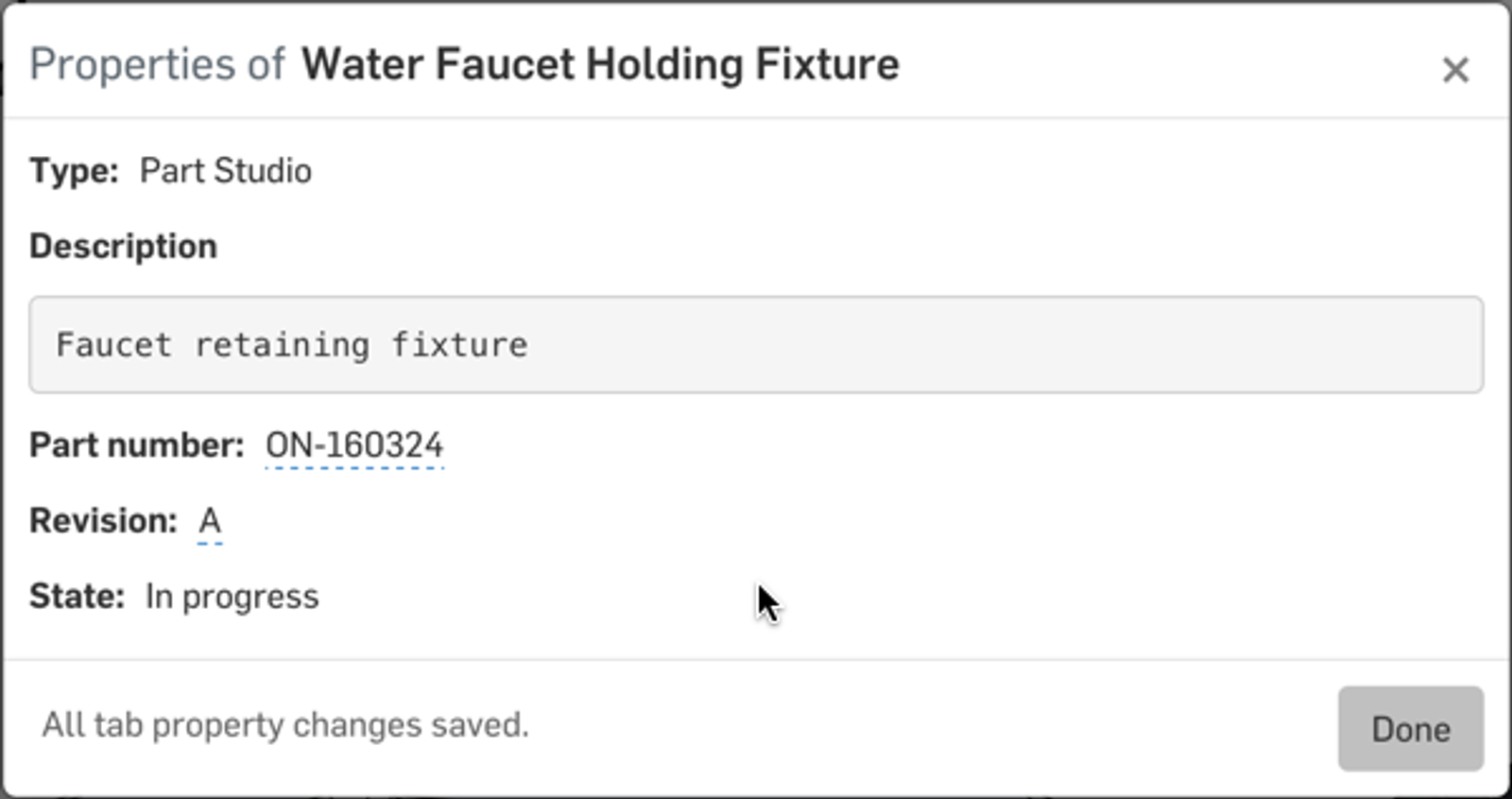 - You can now set Part Studio Properties by right-clicking the Part Studio tab and selecting Properties. This process is now consistent across Part Studios, Assemblies, and Drawings.