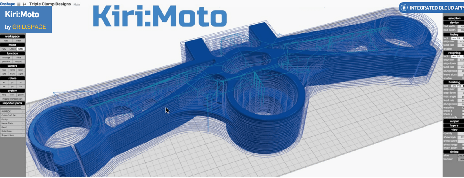 Kiri:Moto is a Swiss army knife of capabilities with integrated CAM, laser cutting and 3D Printing modes.