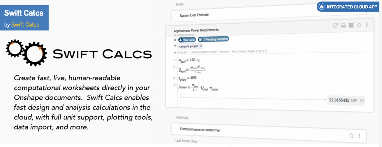 Swift Calcs is an intuitive and collaborative computational notebook. Its powerful math engine combines MathCAD-like computational capabilities with ‘Google Docs’-style usability and versatility. With Swift Calcs, you enter math equations as they appear on paper, get immediate answers, and share your work instantly with colleagues and clients from any device, anywhere. No special syntax, no software, no headaches, no kidding.