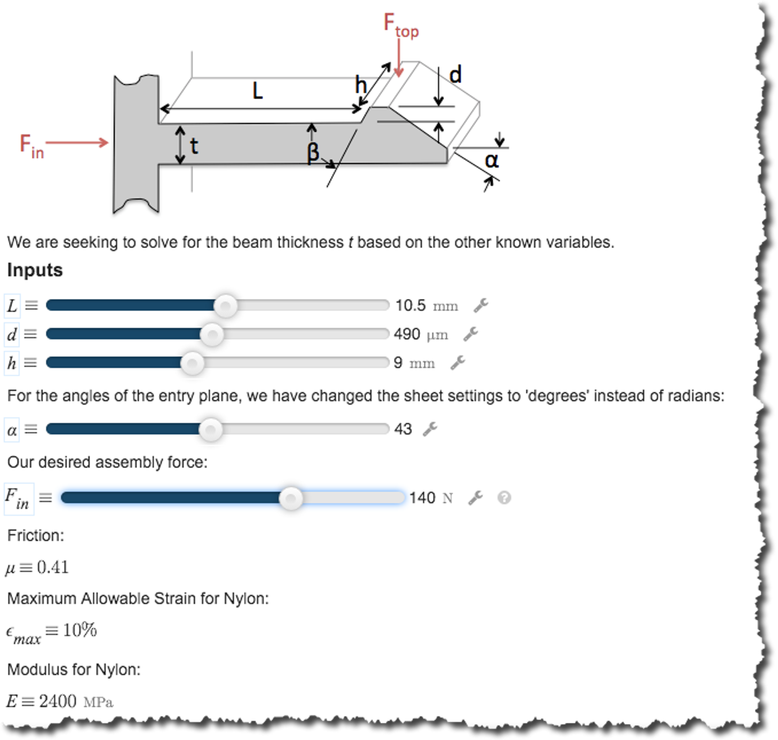 Example: Let's take a look at calculating the size of a plastic snap fit. What is the proper thickness for a given plastic snap fit?