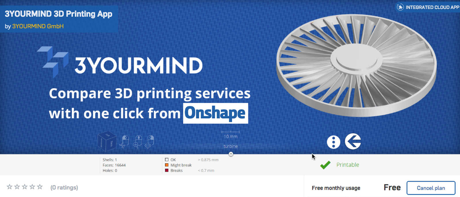 3YOURMIND is a simple but elegant 3D printing service. The app lets you analyze models, compare material costs and compare prices of various services for 3D printing your Onshape part.