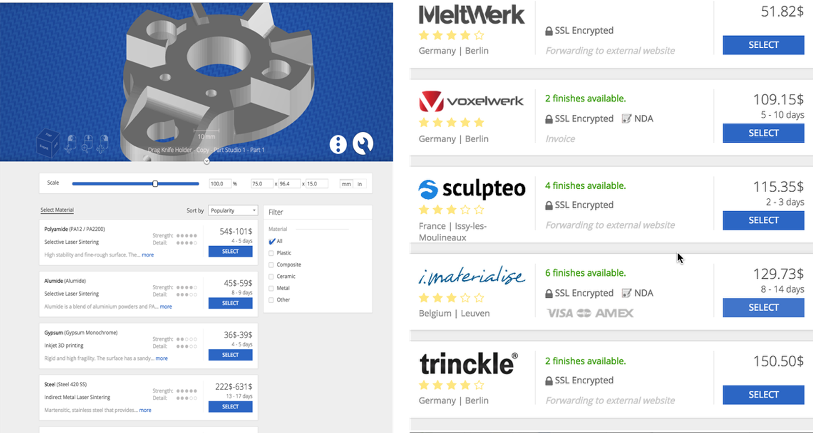 3YOURMIND is a one-stop shop for 3D printing. It lets you compare 3D printing options and see prices from various 3D printing services depending on scale and material. You can also repair and analyze your model.