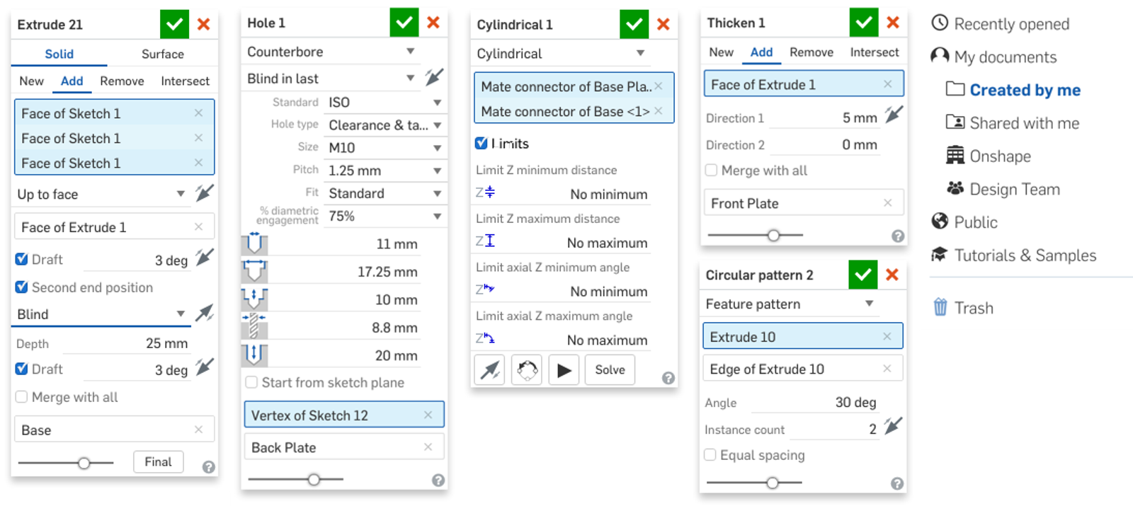 The user interface throughout Onshape now has a cleaner look and feel, including labels on numeric values (so you don't need to view the tooltips to see what values are required) and filter icons on the Documents page.