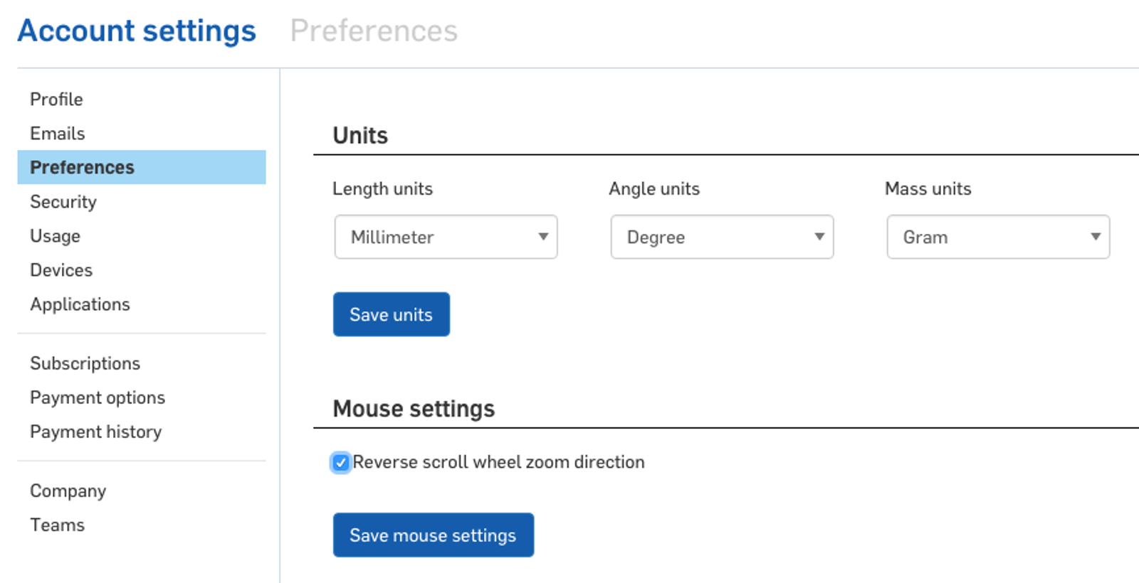 You can now reverse the scroll wheel zoom direction. This is useful if you use or are transitioning from a traditional 3D CAD tool like SolidWorks, Inventor, or Creo. Go to "Manage account" under your name in the top right corner, then "Preferences."
