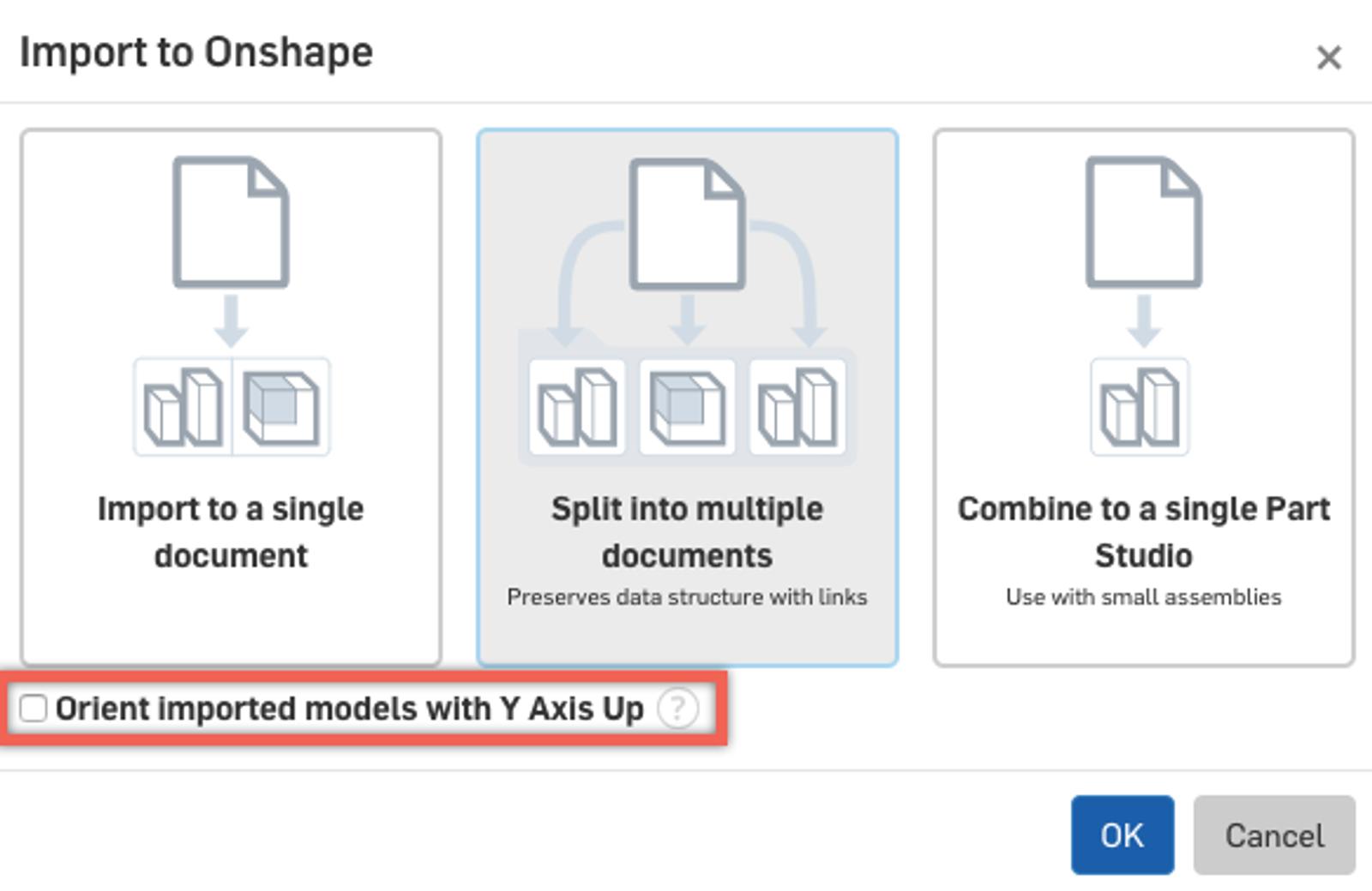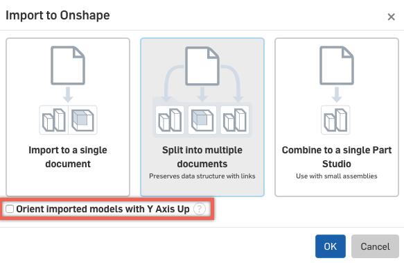 You can now choose the option to "Orient imported models with the Y Axis Up" when importing into multiple Onshape Documents. In the past, this option was limited to importing to a single Document.