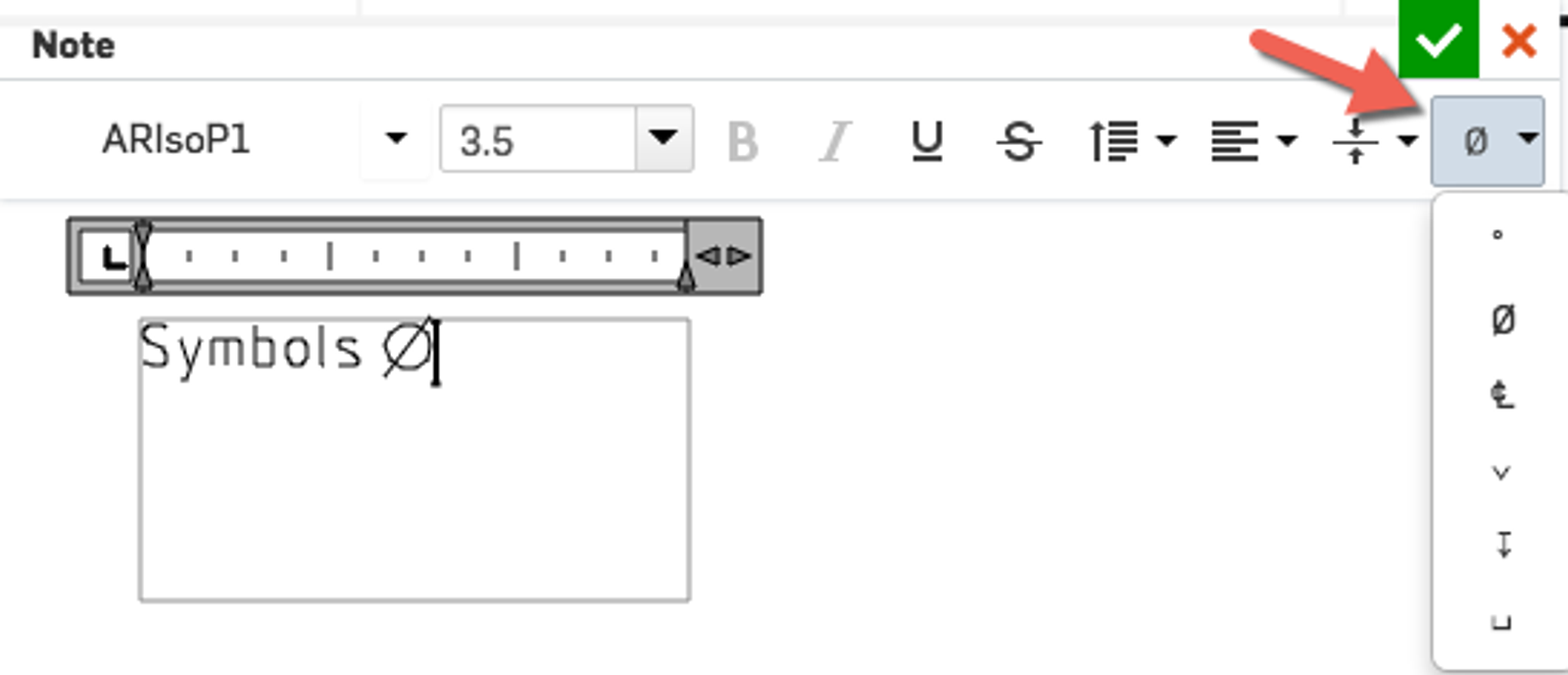 Symbols can now be inserted into drawing notes. When creating notes, you will see a new symbols menu.