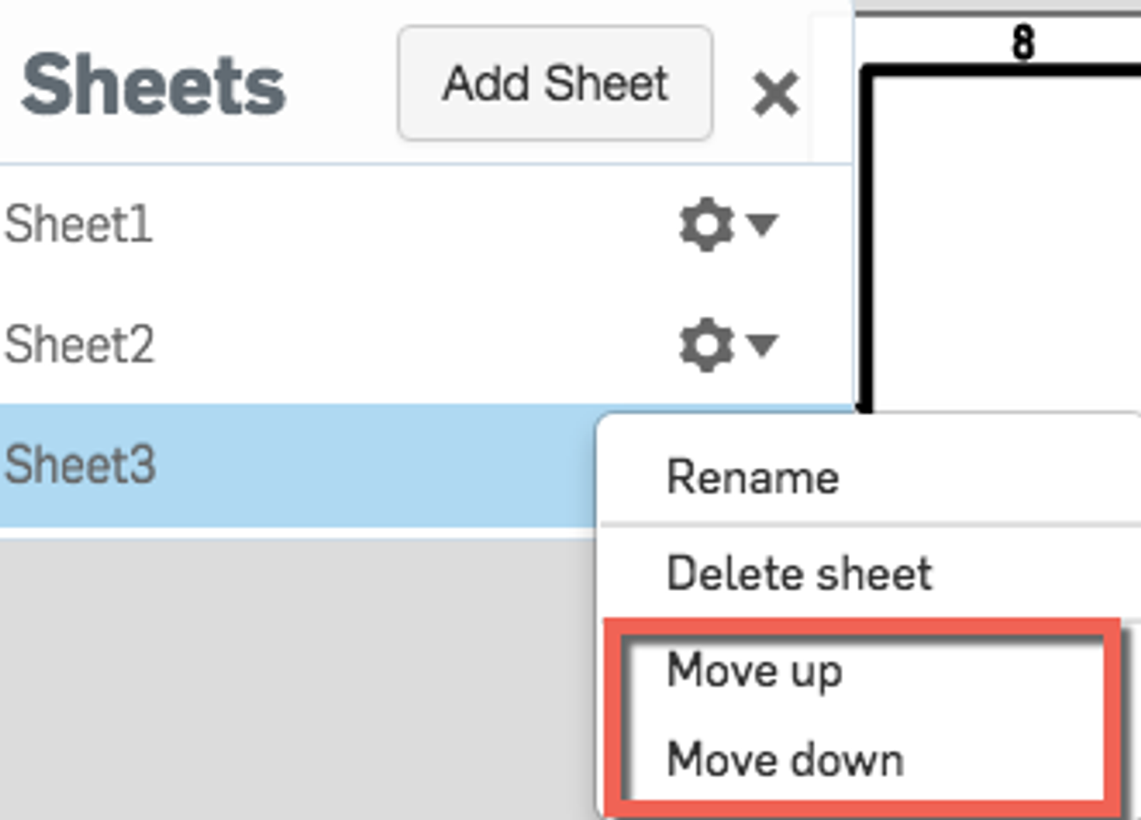 Sheets can now be reordered in drawings. Simply select the Sheets command from the toolbar, select the gear menu from the sheet you would like to move, and choose “Move up” or “Move down.”