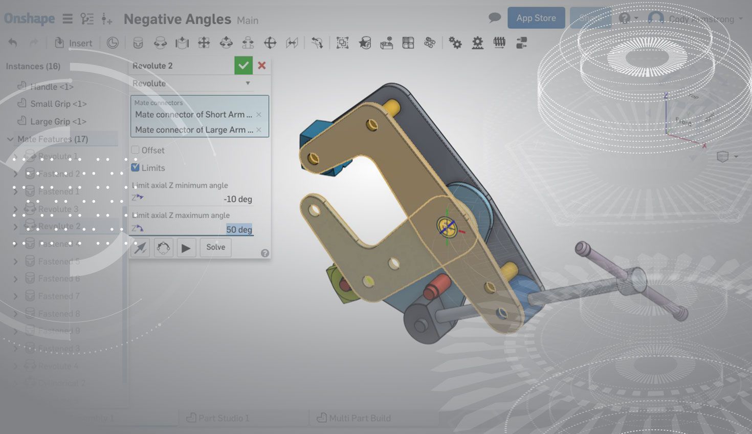 Negative angle mate limits are now supported in Onshape Assemblies. This makes defining range of motion from a neutral position much easier.