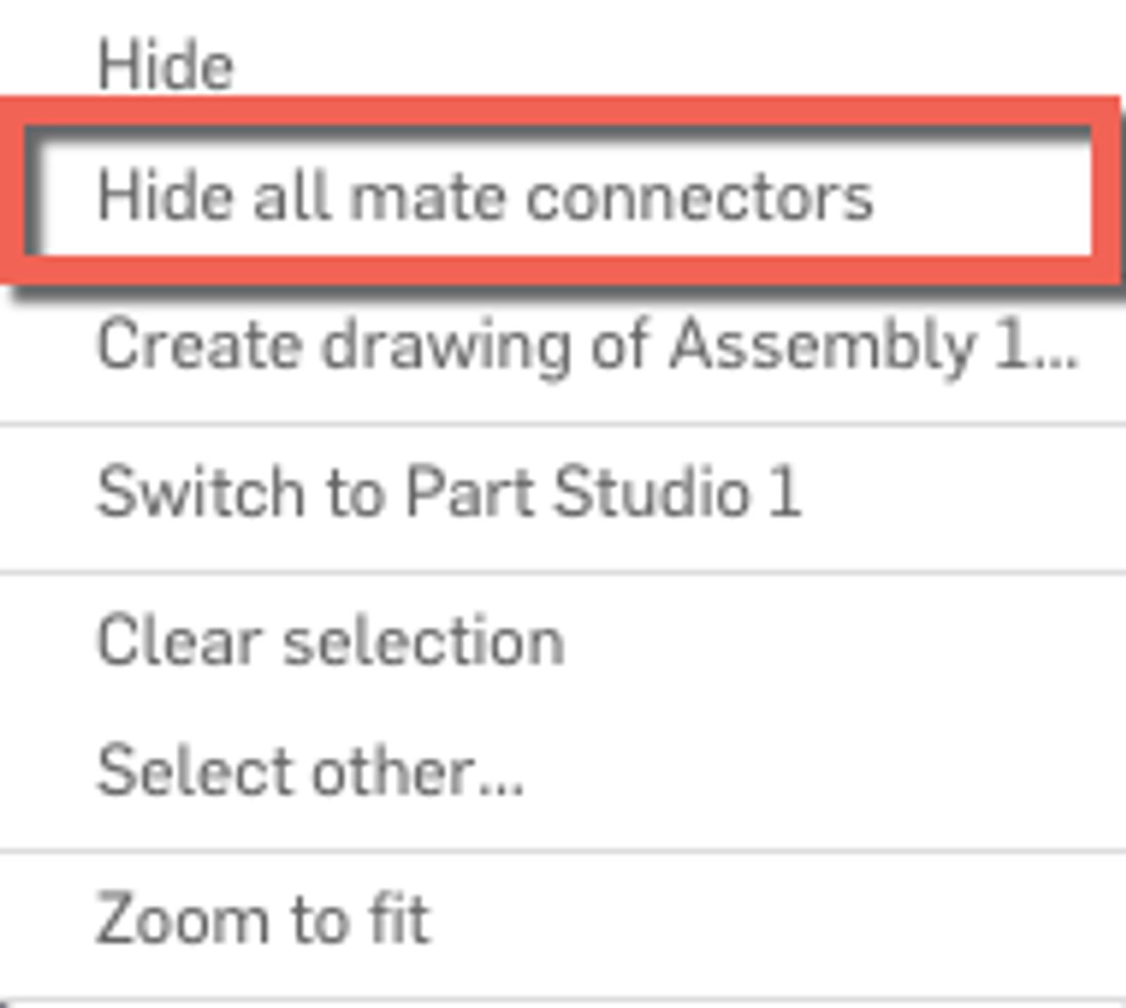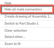 All mate connectors can now be hidden with a single command. When right-clicking a mate connector, you will see a new “Hide all mate connectors” command. This replaces the “Hide other mate connectors” command and makes it easier to hide everything at once.