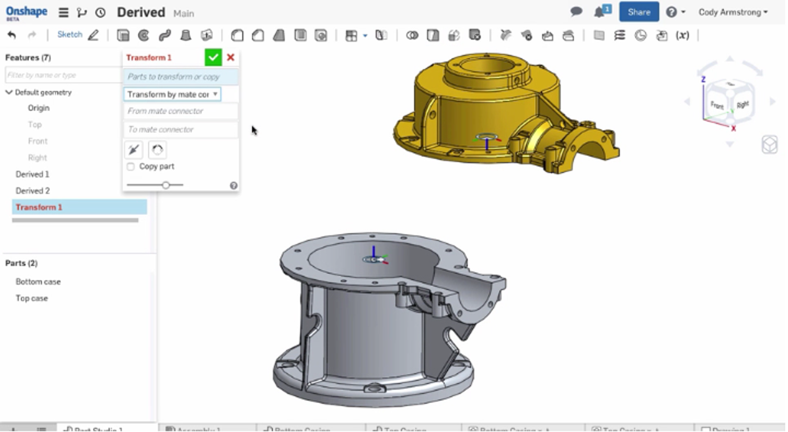 “Transform with Mate Connectors” makes it much easier to position parts in a Part Studio with respect to each other. Simply select the “Transform with Mate Connectors” option in the Transform command and select mate connectors from each part.