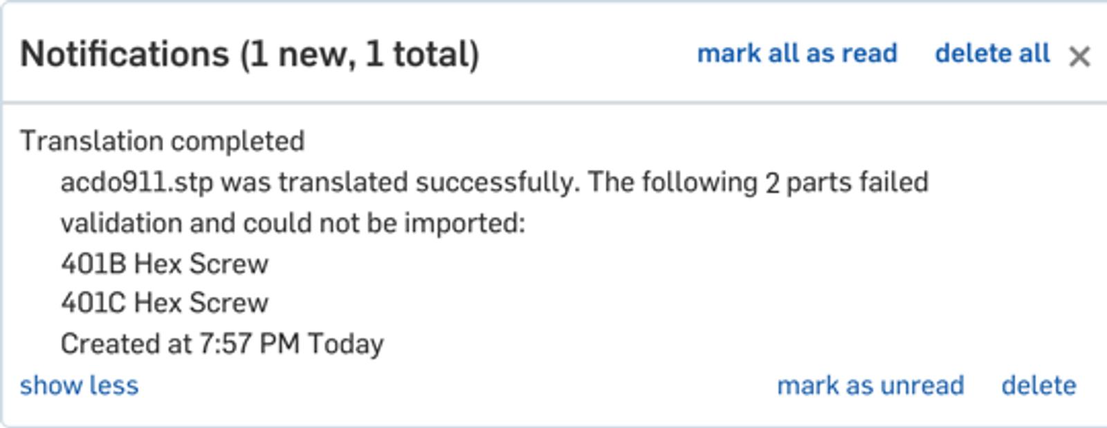 When 3D data is imported into Onshape, each body is checked to ensure it is a valid solid. In this latest update, Onshape now lists the names of all the parts that failed validation to make it easier for you to locate the troublesome parts.
