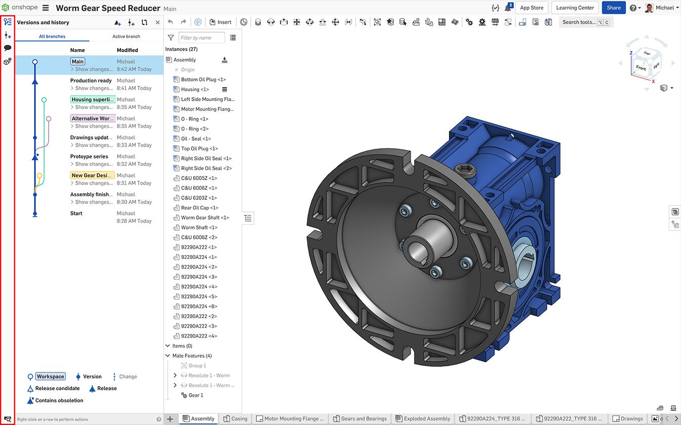 Versions and History, Create Version, Comments, Where Used (currently only Enterprise) and Tab manager icons are now grouped together on the left side of the screen in the new Document Panel. Clicking one of these icons opens the Document Panel to the left of the Feature/Instance list so the screen area is no longer obscured by individual dialog boxes. The Document Panel is expandable so the Version graph is now easier to read and access, and the icon panel allows space for future planned improvements.