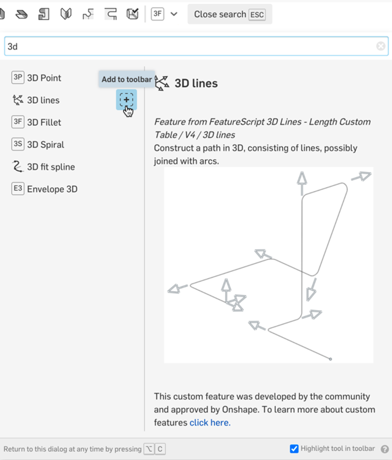 The Search tools button in the top right corner of a Part Studio can be used to quickly find a modeling feature even if it is not currently on your toolbar. The Search feature has been extended to include a curated set of Custom Features that have been quality-checked and maintained by Onshape. At this time, there are six custom features that can be searched for: Spur gear, Belt, Lighten, Point pattern, 3D Lines, and Wiring with more to be added in the future. The search results dialog will show a description, an image and a “+” button next to the feature name so you can add it to your toolbar if you wish.