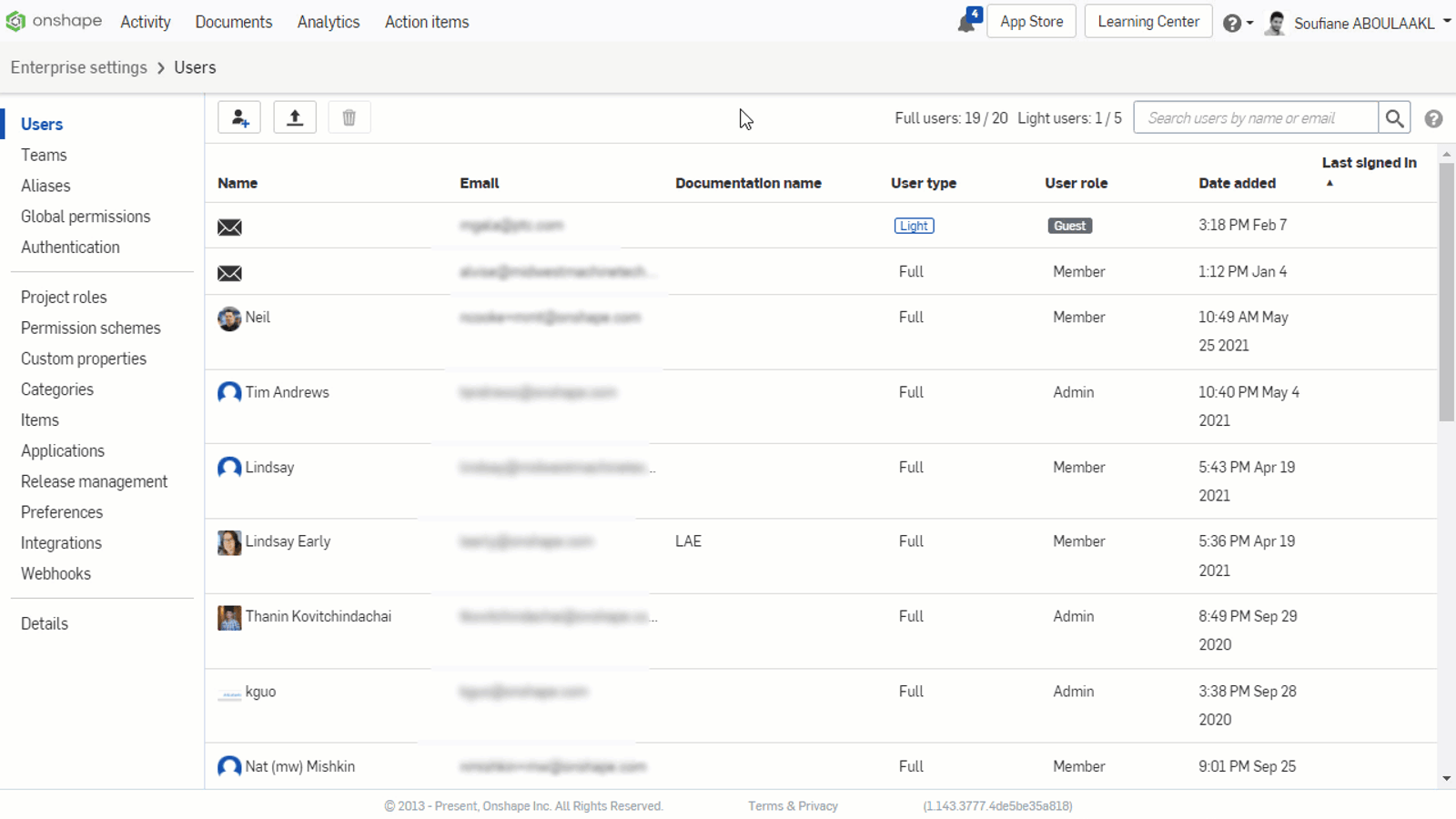 A new sortable column called "Last signed in" has been added to the Users list for Onshape Enterprise. This allows you to easily see which users have not signed in to the enterprise for a period of time.