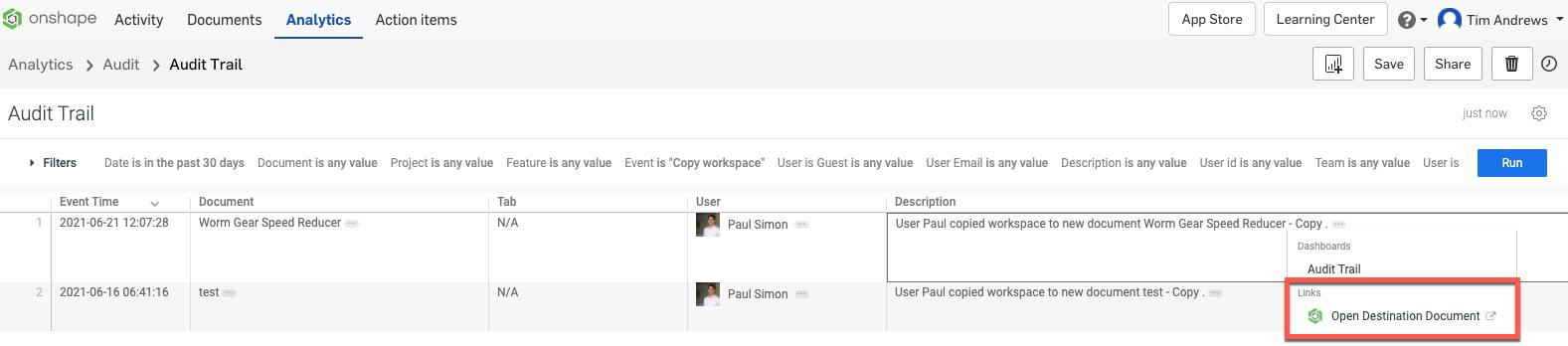 When viewing "copy workspace" events in the audit trail, the event description now includes the name of the destination Document created when copying another Document. If you click on the Overflow menu for this event, you'll see an option to open the destination Document.