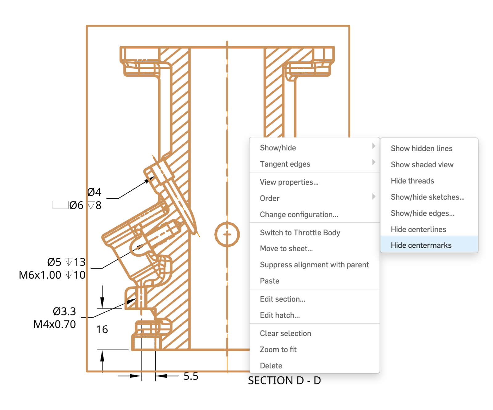 Centerlines are now automatically inserted for views with cylindrical geometry. These centerlines are shown by default for part views but are hidden for assembly views. They can be toggled on or off from the right-click menu.