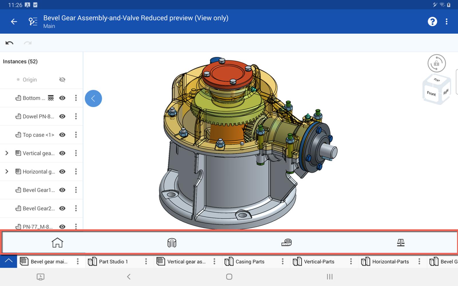 You will now see a view-only toolbar when opening view-only Onshape Documents on Android devices. This toolbar makes a Document easier to navigate for those who are not experts.