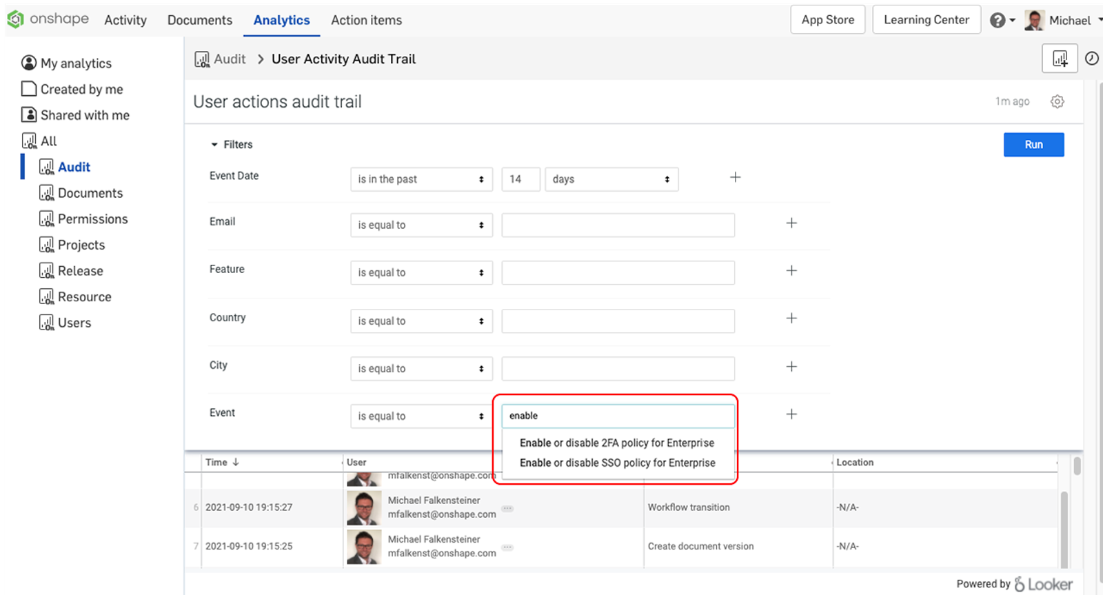 If you are signed in as an Enterprise admin, you now have the option in the User Activity Audit Trail Dashboard to display the events “Enable or disable 2FA” (two-factor authentication) or “Enable or disable SSO” (single sign-on). An audit trail can be generated and downloaded that shows when these security policies were activated or deactivated for your Enterprise.