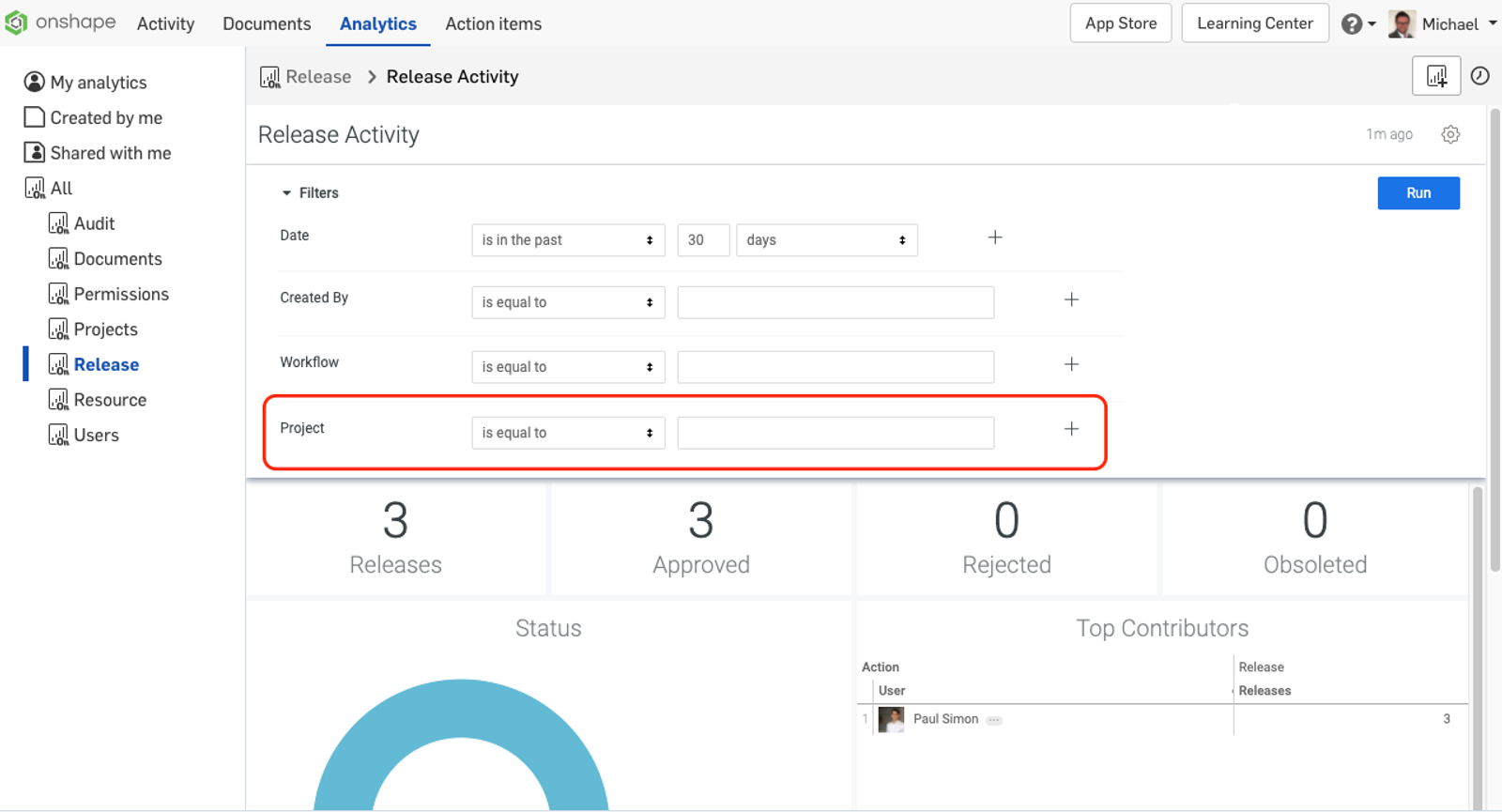In Analytics, a new option to filter for projects has been added to the Release Management dashboards.